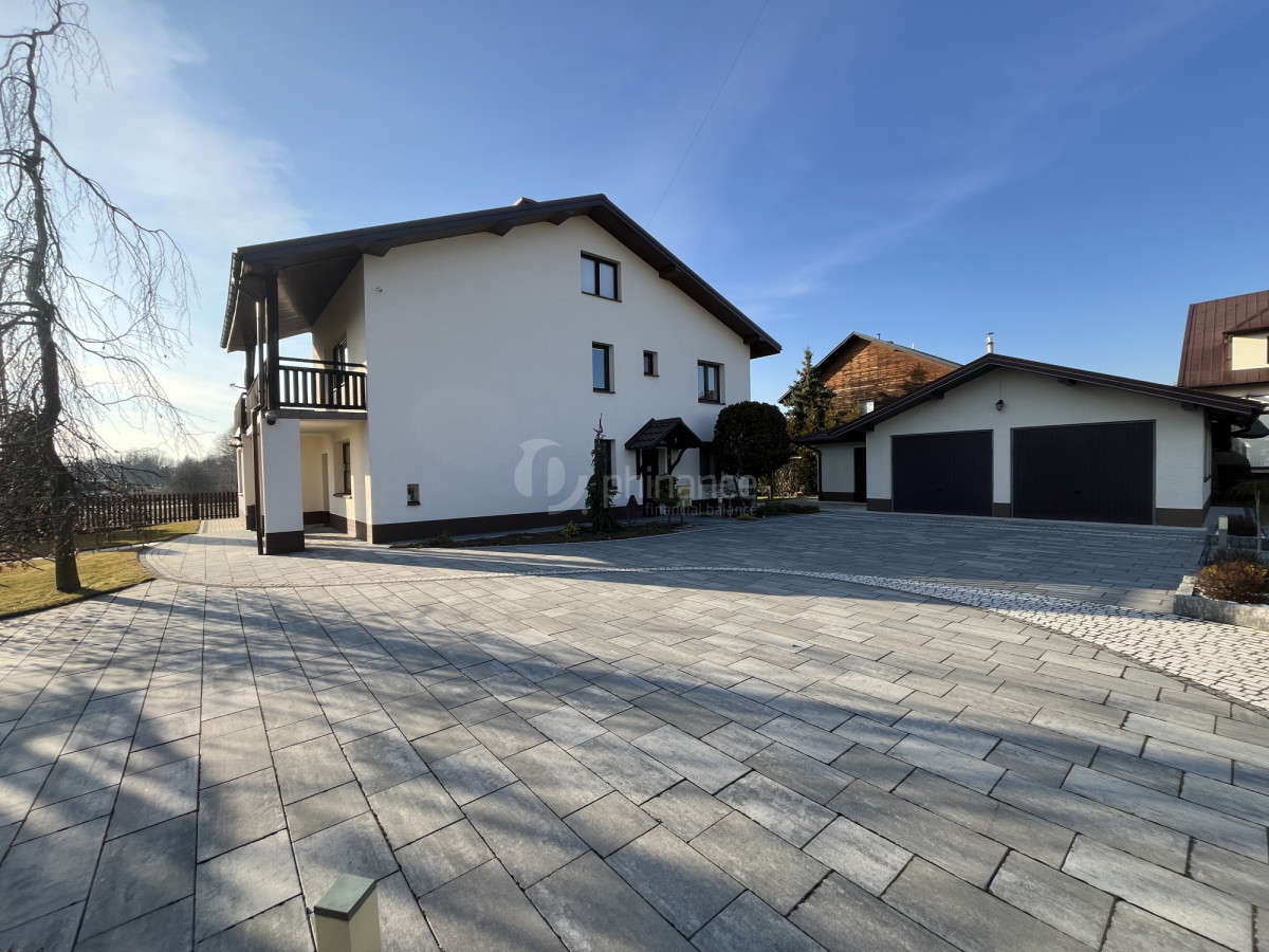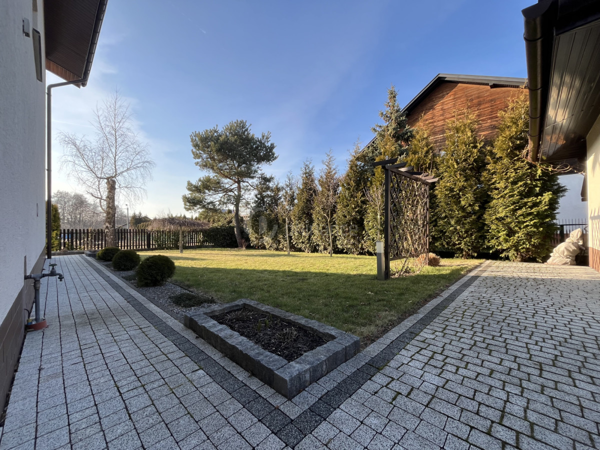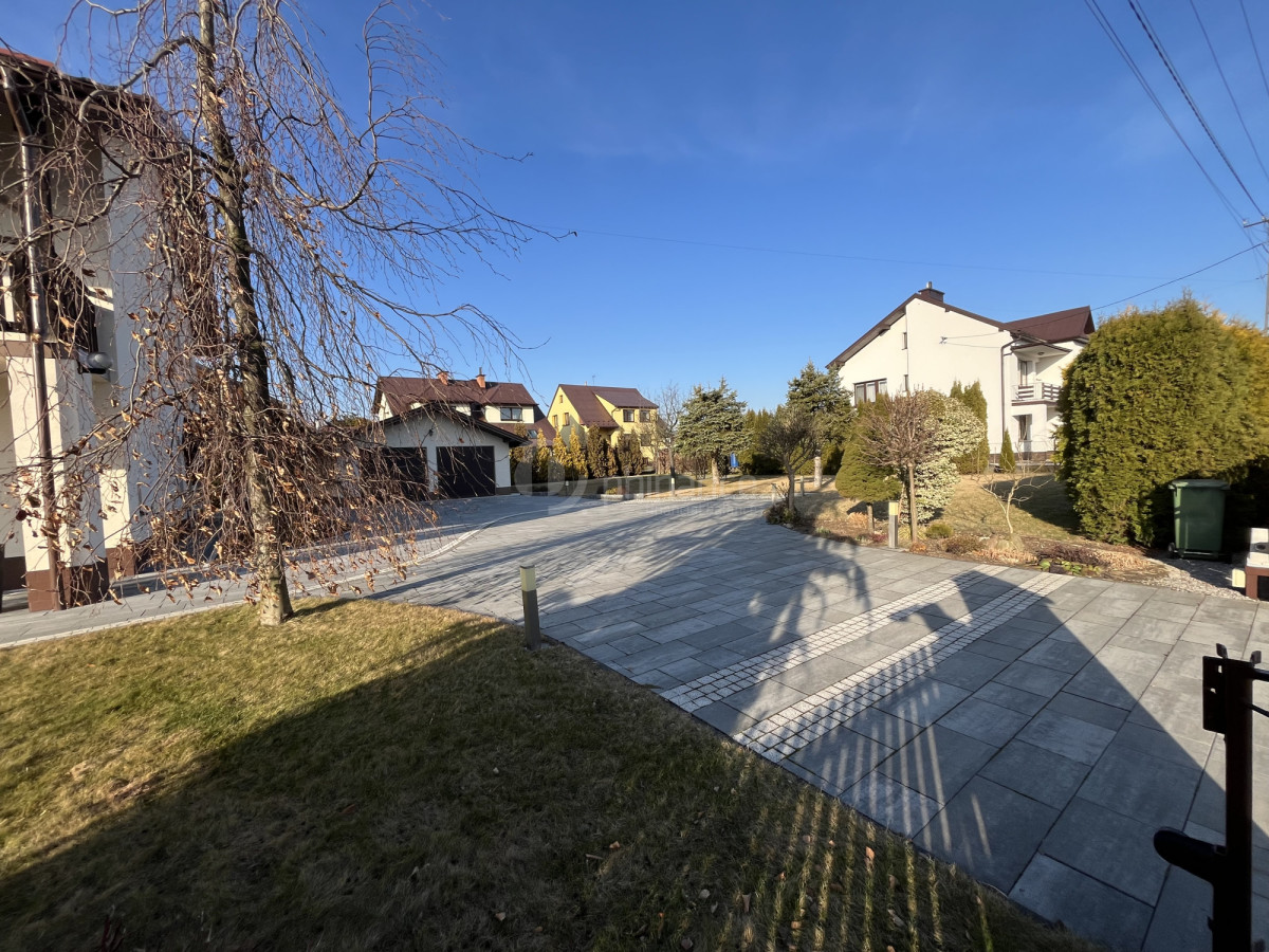 - 11 arowa, zadbana z wieloma drzewami, nasadzeniami i krzewami. Możliwość dokupienia dodatkowych 3 arów. Podjazd do garaży wyłożony kostką. Lampy ozdobno- oświetleniowe na działce.