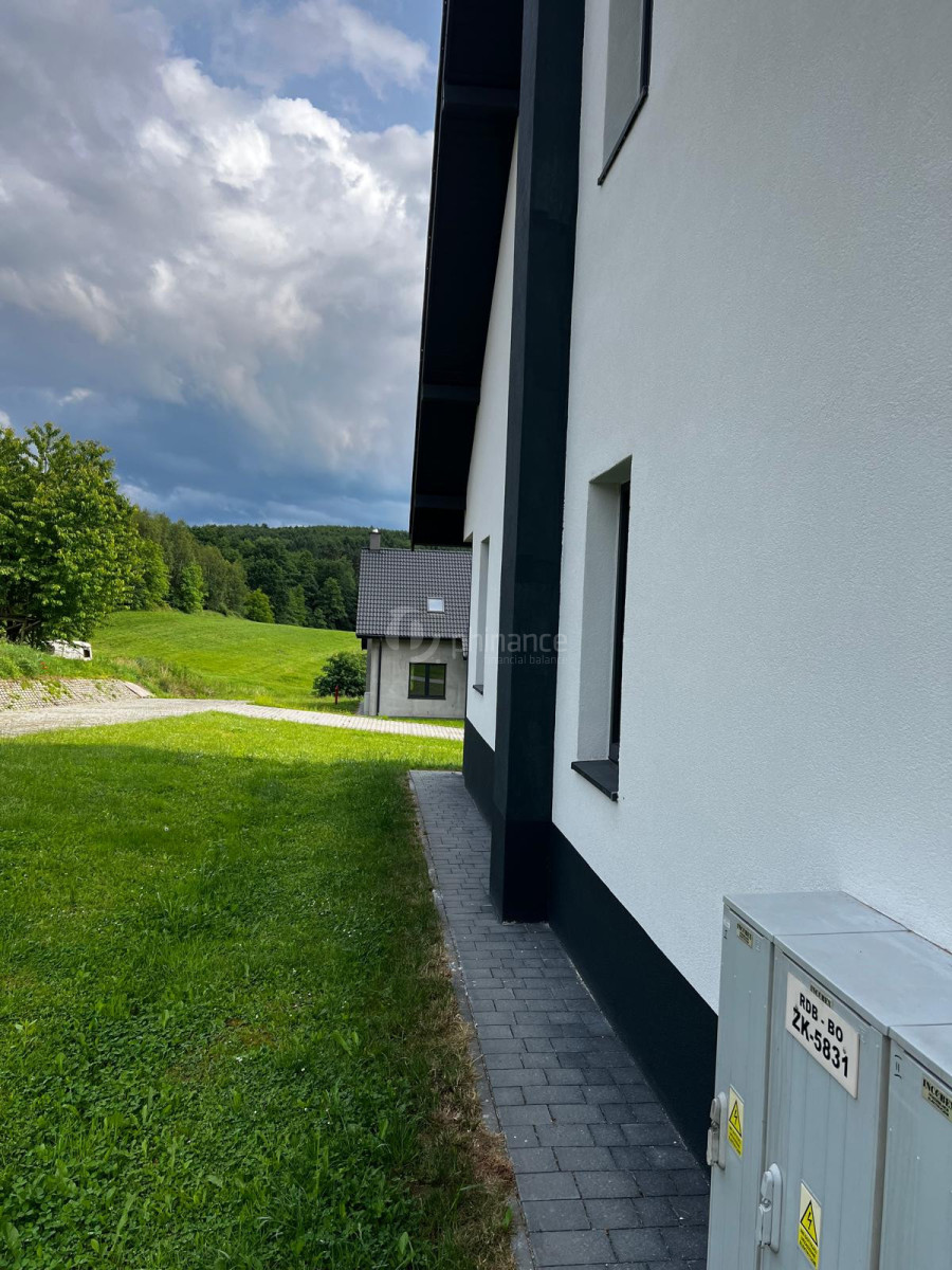 Brzeźnica k/Bochni -skrajny segment domu bliźniaczego z poddaszem, garażem, piwnicą i ogrodem - bez konieczności wykańczania położony w spokojnej okolicy w bezpośrednim otoczeniu lasu . Dojazd drogą gminną asfaltową. Budynek posadowiony na działce o powierzchni 5,68 ara.