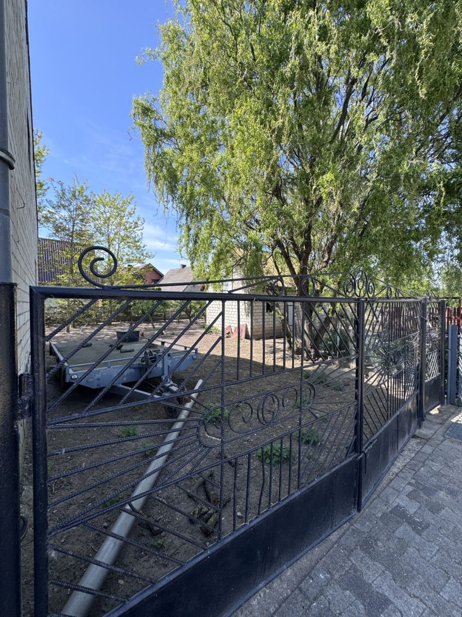 • Teren ogrodzony: murowane słupki z kamienia, przęsła kute.