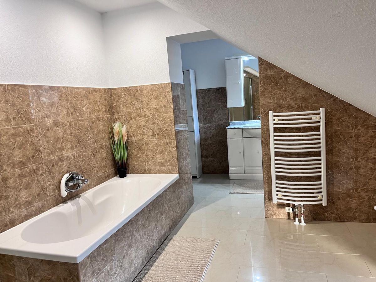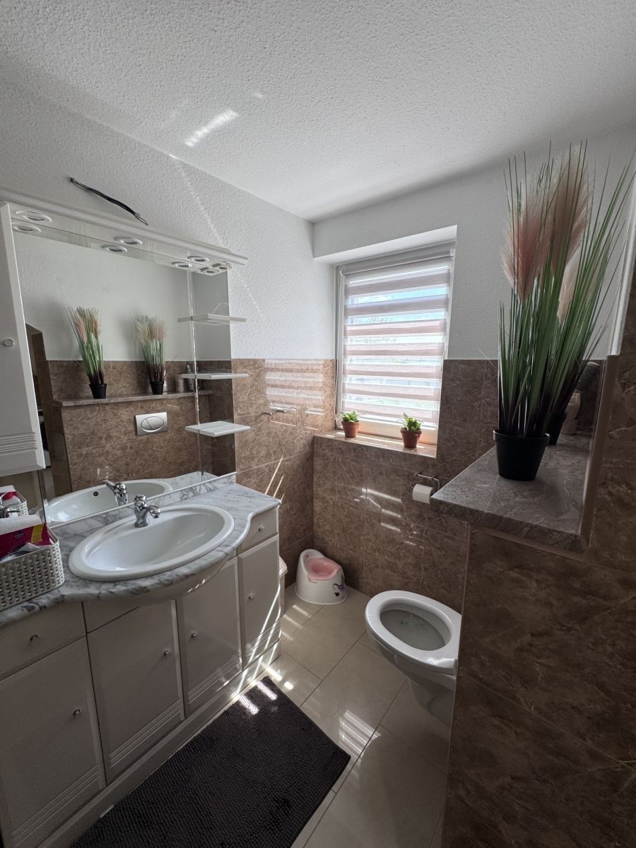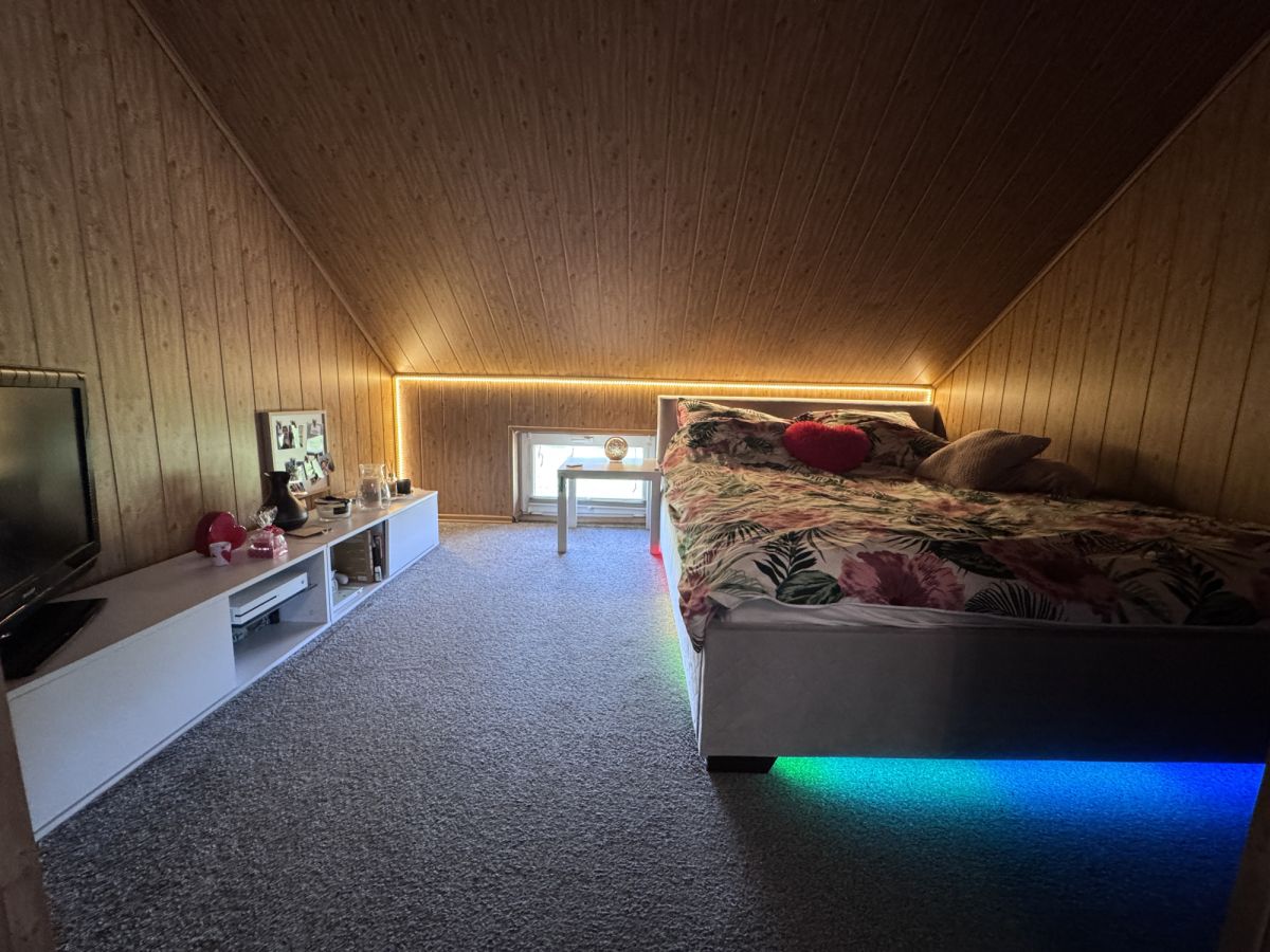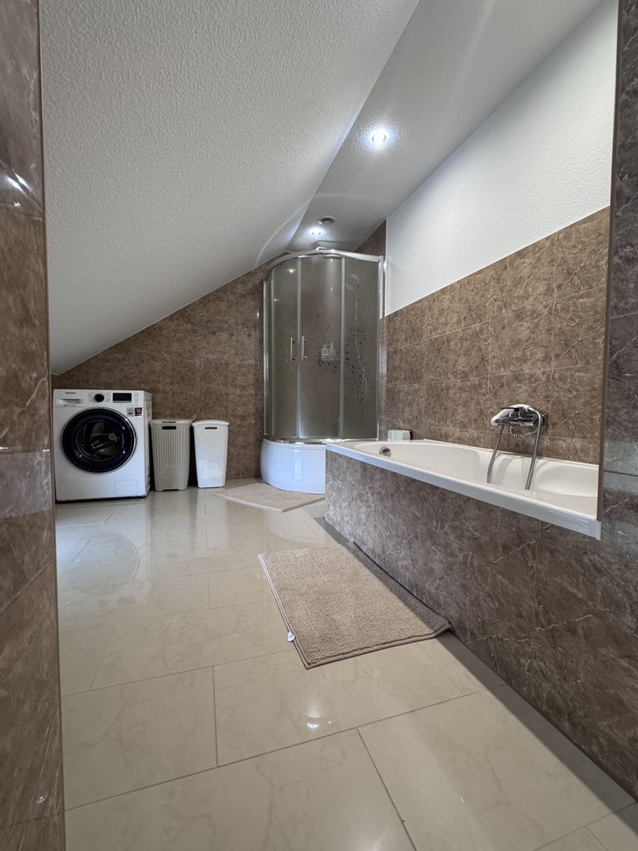 • Piętro: 3 sypialnie, duża łazienka (wanna + prysznic), pomieszczenie gospodarcze (możliwość adaptacji na garderobę).