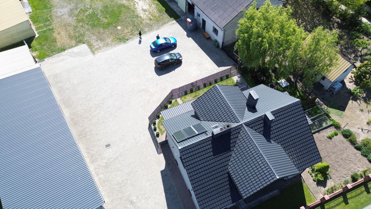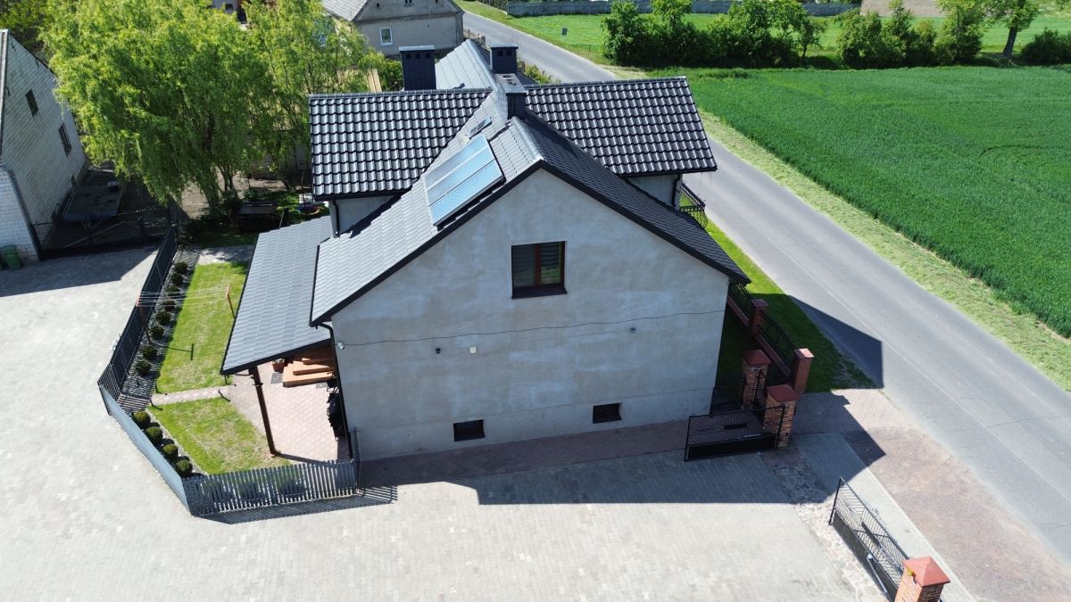 • Woda z sieci, przydomowa oczyszczalnia ścieków, kolektory słoneczne na dachu.