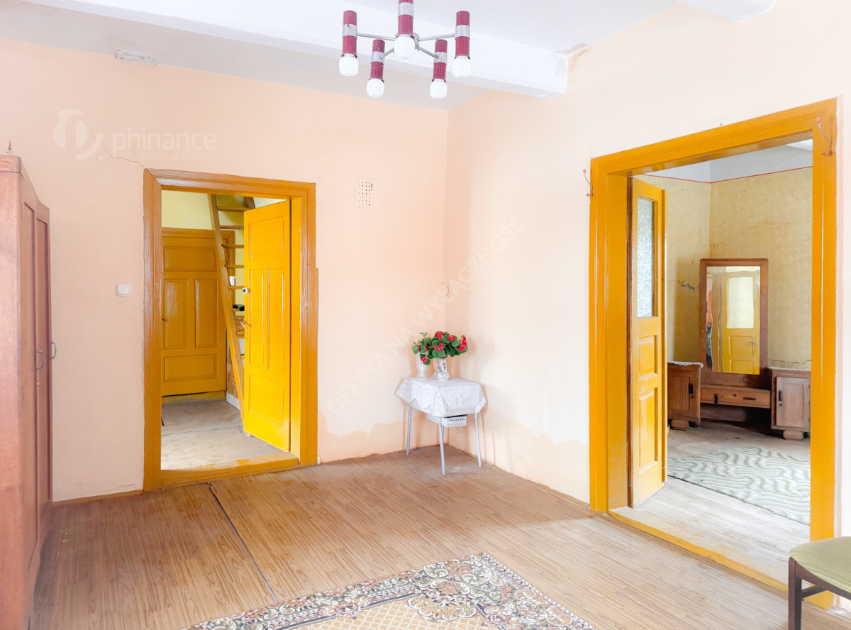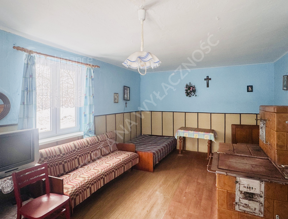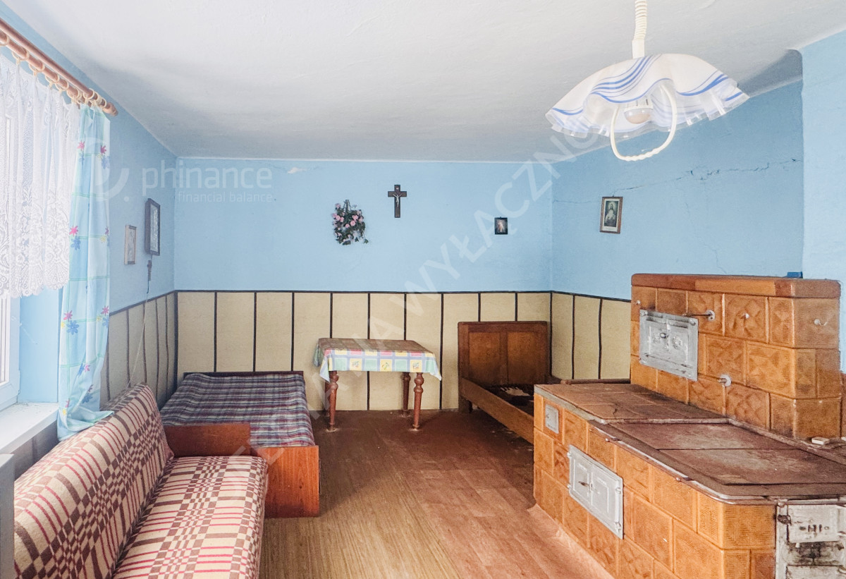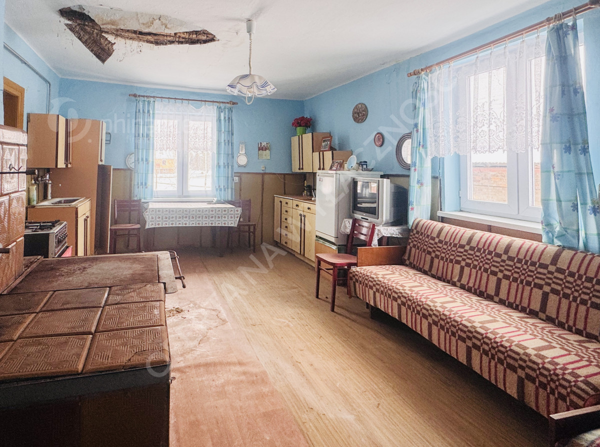 Dom ma powierzchnię około 100 m² i został posadowiony na wysokiej podmurówce. Budynek jest pokryty dachówką. W jego wnętrzu znajdują się dwa pokoje, kuchnia z tradycyjnym piecem kaflowym oraz dodatkowe pomieszczenie, które można przeznaczyć na łazienkę, spiżarnię lub pokój gospodarczy. Do dyspozycji pozostaje także strych oraz piwnica. Dom wymaga remontu, co daje przyszłemu właścicielowi możliwość aranżacji przestrzeni według własnych potrzeb i gustu.