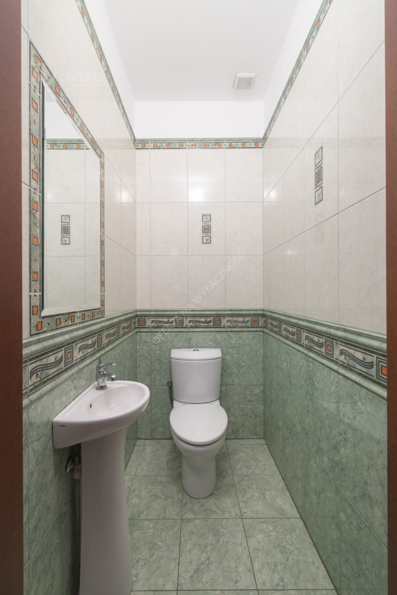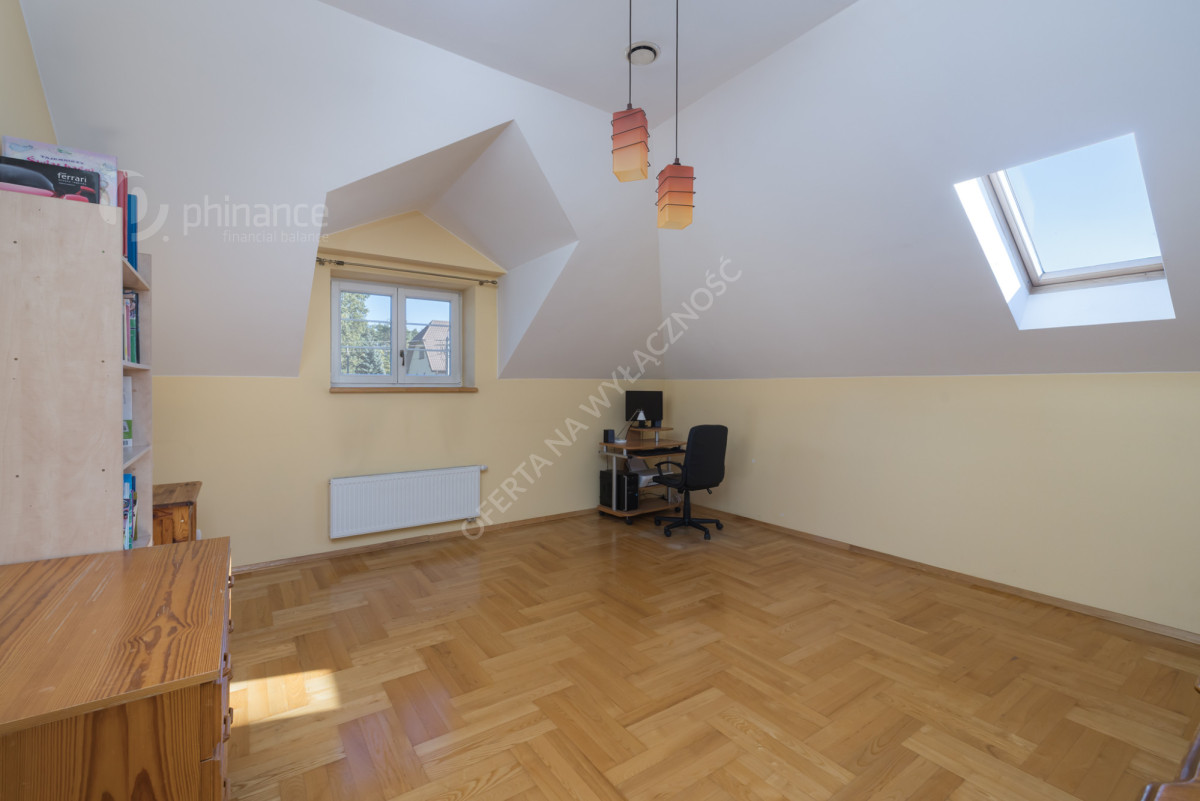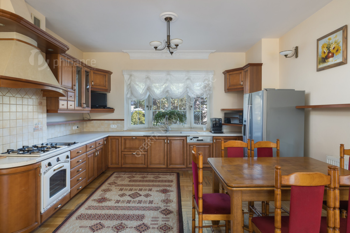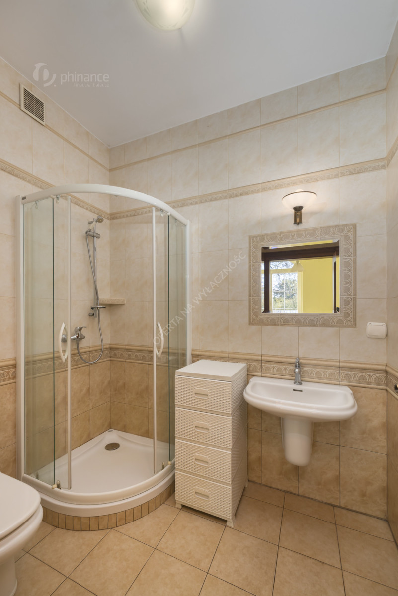 Salon z pełni wyposażoną kuchnia, 4 pokoje, 1 łazienka (WC, prysznic, wanna), osobne WC, druga łazienka (WC, prysznic). 2 stanowiskowy garaż w bryle budynku oraz miejsca postojowe przed domem. Piętro - 4 sypialnie, łazienka (umywalka, prysznic, pralka) oraz osobne WC.