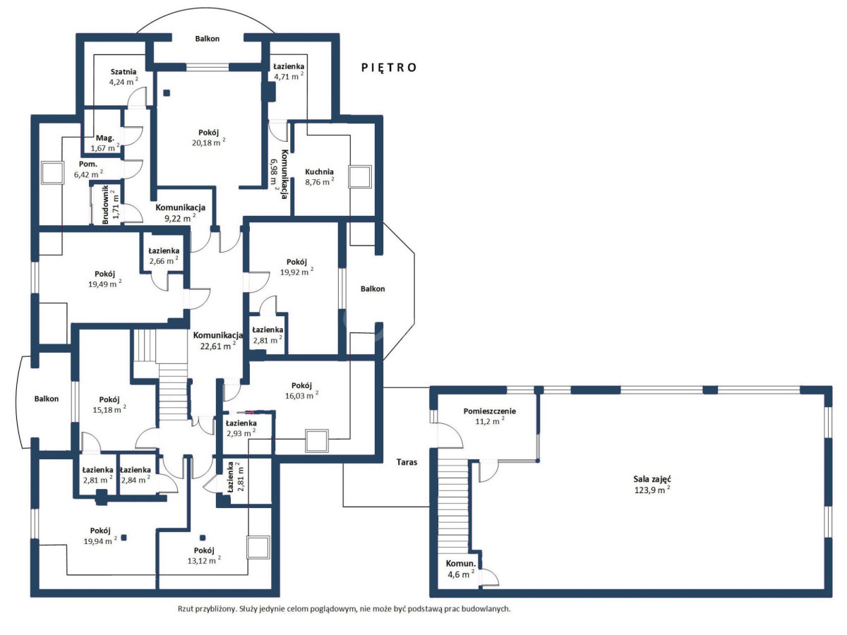 - Przestronna sala zajęciowa: 123,9 m²