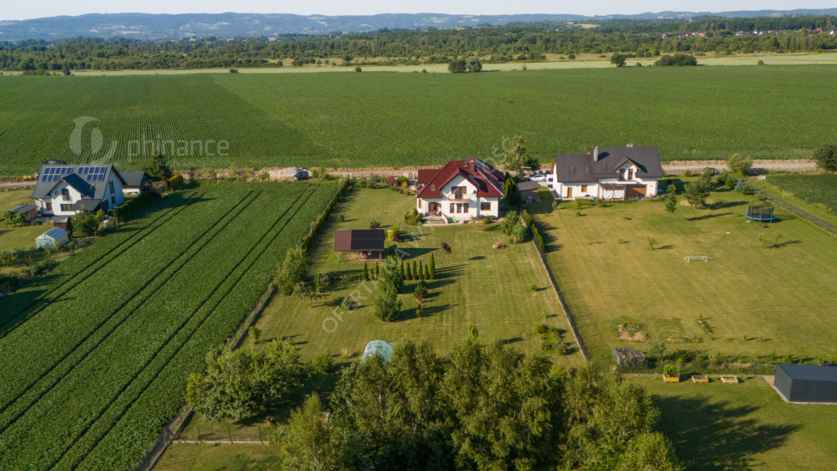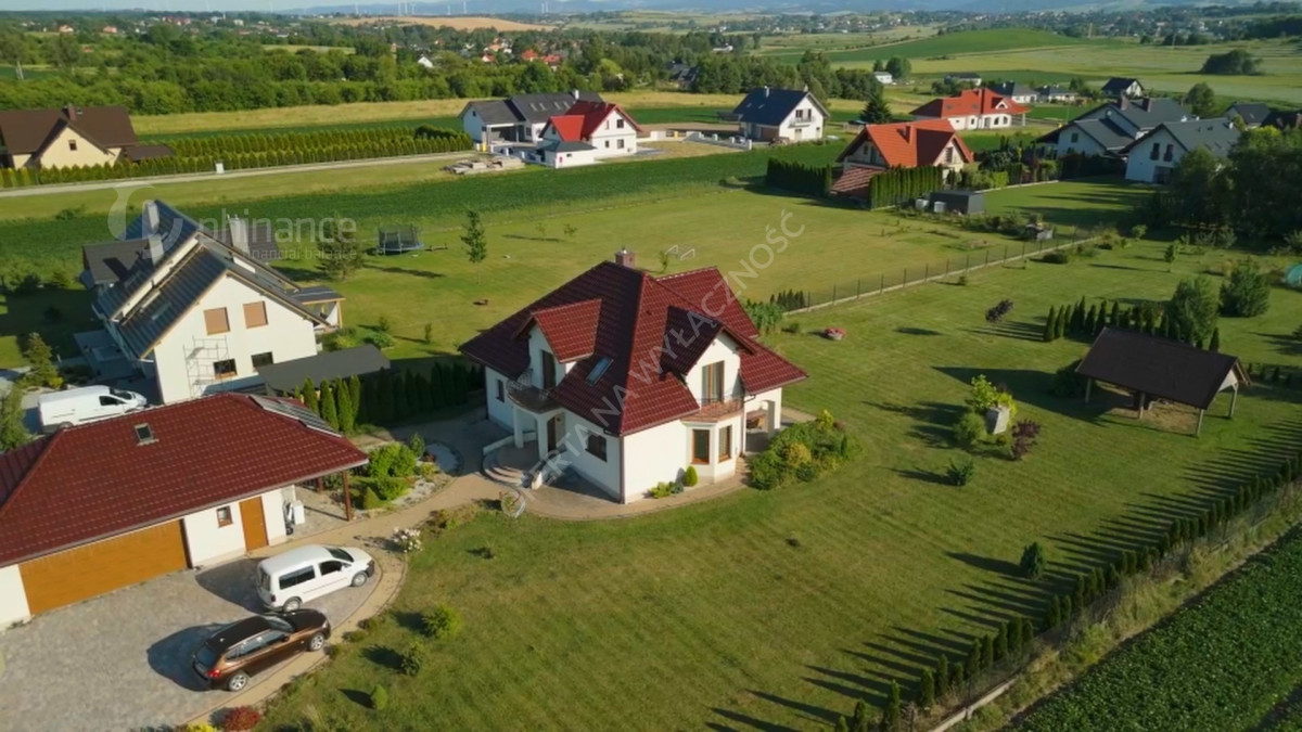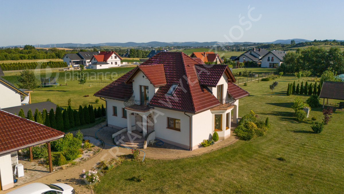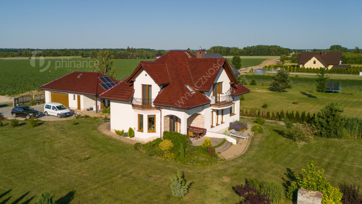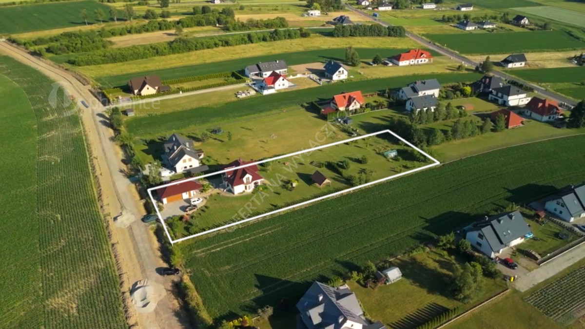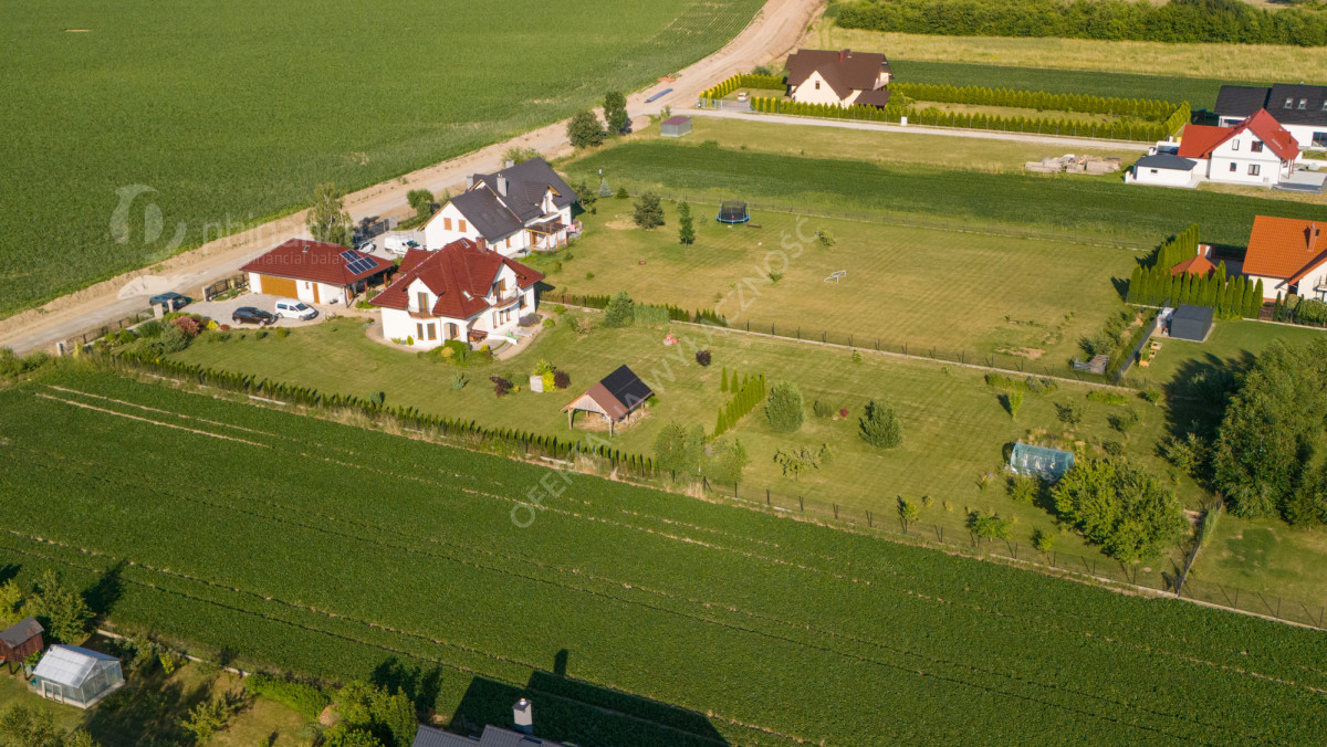 Dom wybudowany w latach 2011-2014 według projektu „Tezeusz III” znajduje się na płaskiej, prostokątnej działce o powierzchni 1900 m² (nr ewid. 2274/1 i 2275/1) z możliwością zakupu większego areału - 3800 m2 w cenie 1 500 000 zł za całość wraz z domem. Dojazd drogą gminną utwardzoną (obecnie w trakcie budowy asfaltowej nawierzchni).