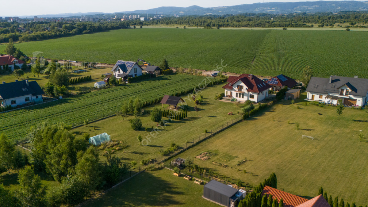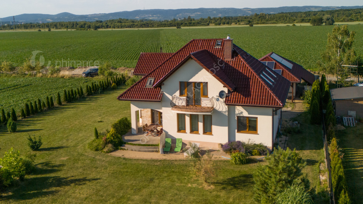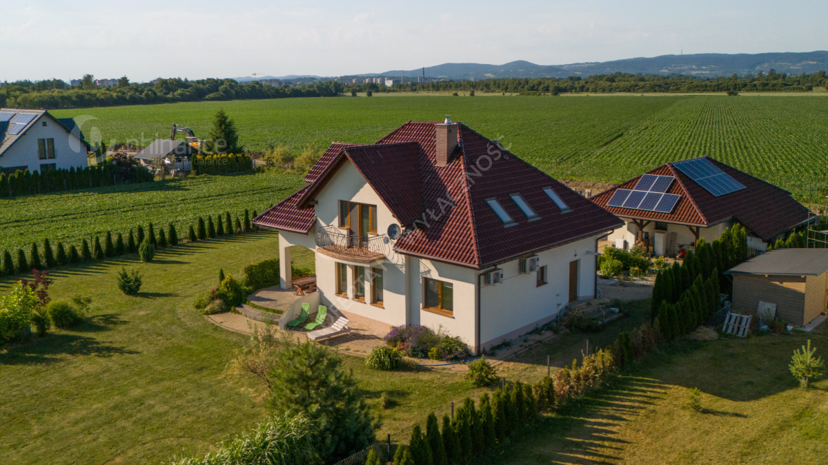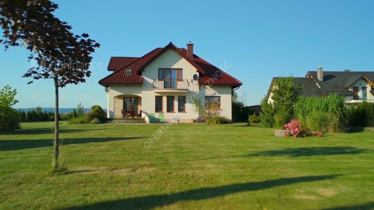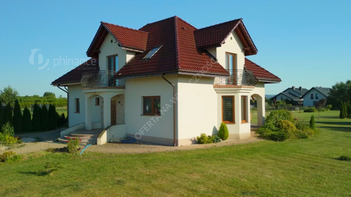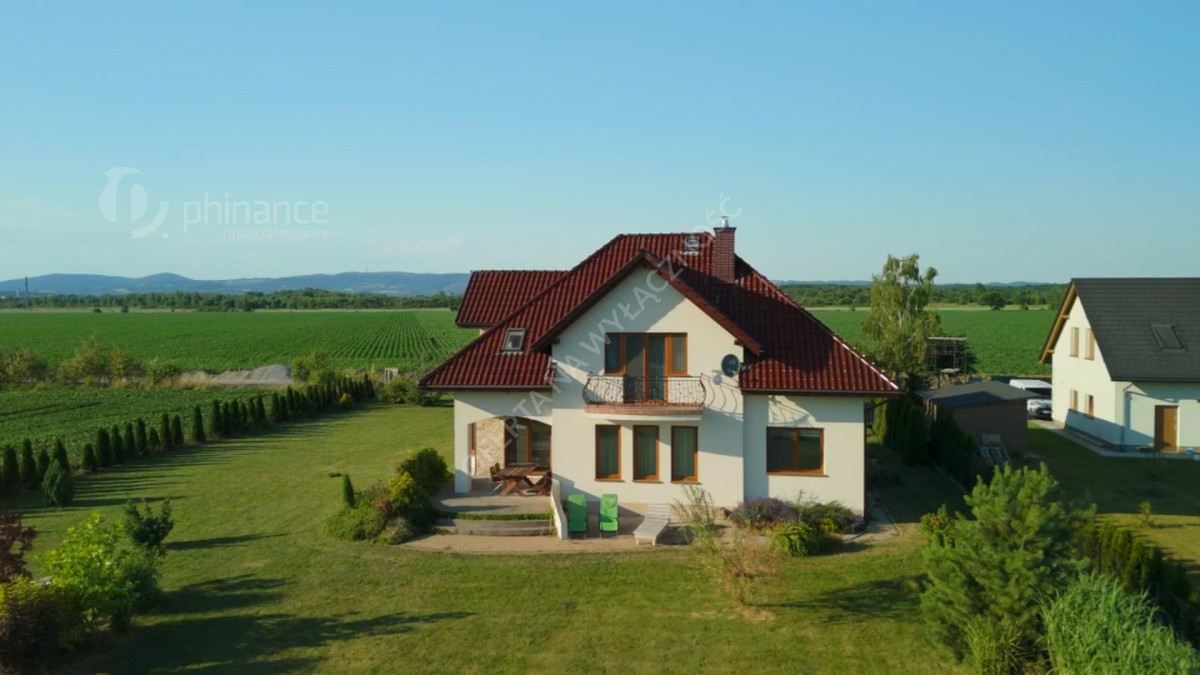 Dom wybudowany w latach 2011-2014 według projektu „Tezeusz III” znajduje się na płaskiej, prostokątnej działce o powierzchni 1900 m² (nr ewid. 2274/1 i 2275/1) z możliwością zakupu większego areału - 3800 m2 w cenie 1 500 000 zł za całość wraz z domem. Dojazd drogą gminną utwardzoną (obecnie w trakcie budowy asfaltowej nawierzchni).