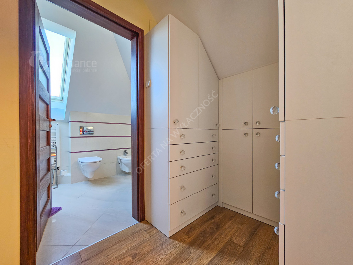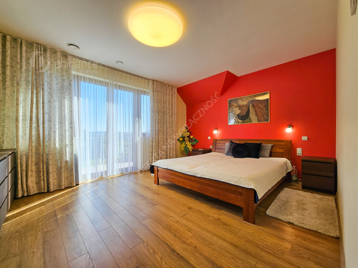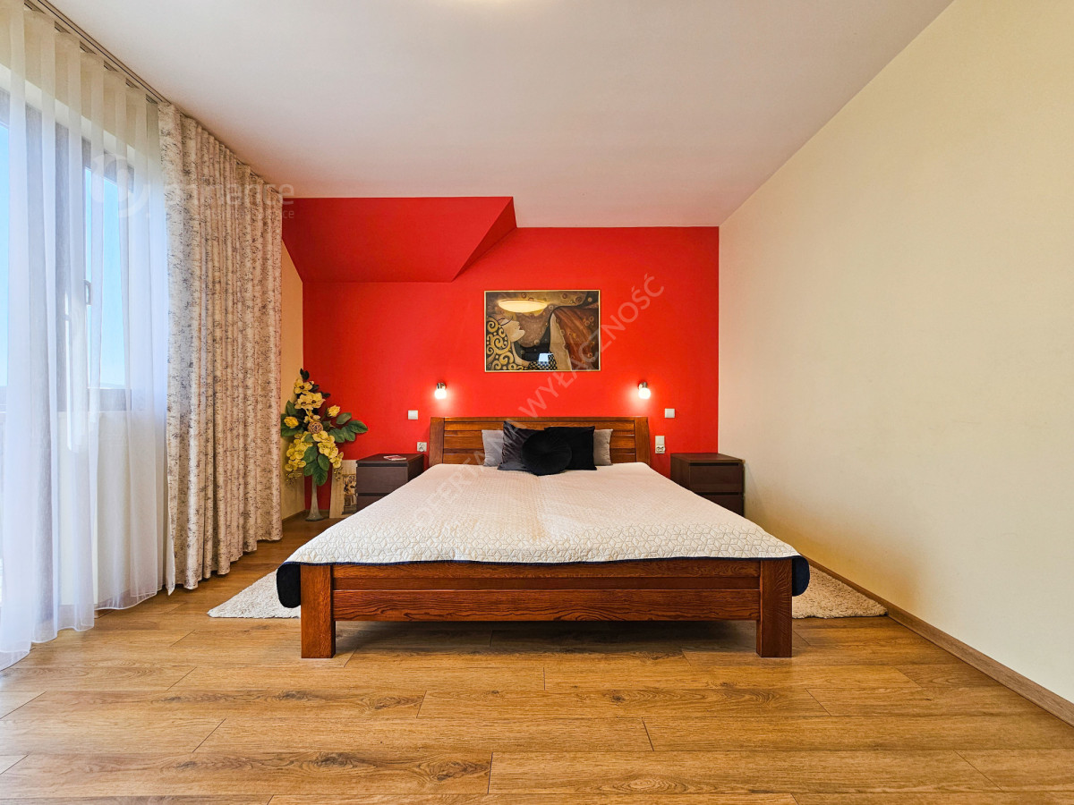 - trzy komfortowe sypialnie z balkonami, w tym główna sypialnia z garderobą i prywatną łazienką z prysznicem