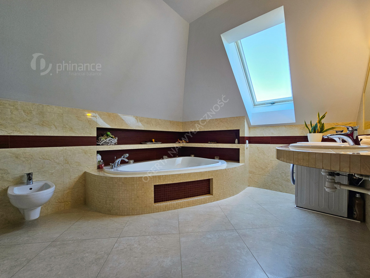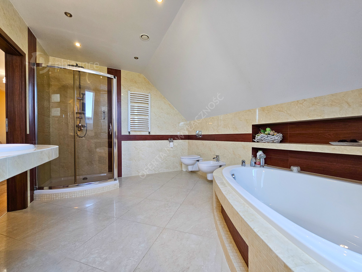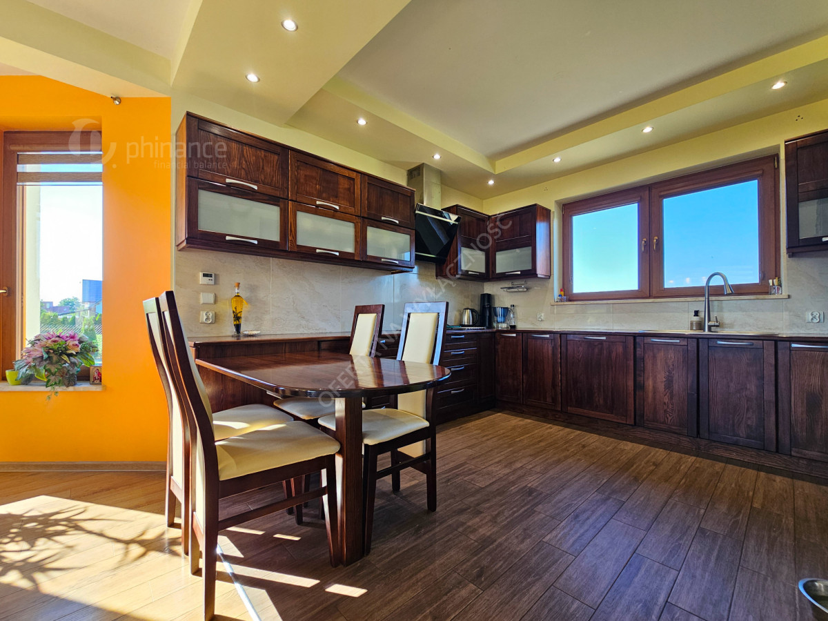 Dom wykończony został z użyciem materiałów najwyższej jakości, co podkreśla jego elegancję oraz trwałość na lata. Dodatkowym atutem jest piękny, zadbany ogród z licznymi nasadzeniami, który stanowi prawdziwą oazę spokoju i relaksu po dniu pracy.