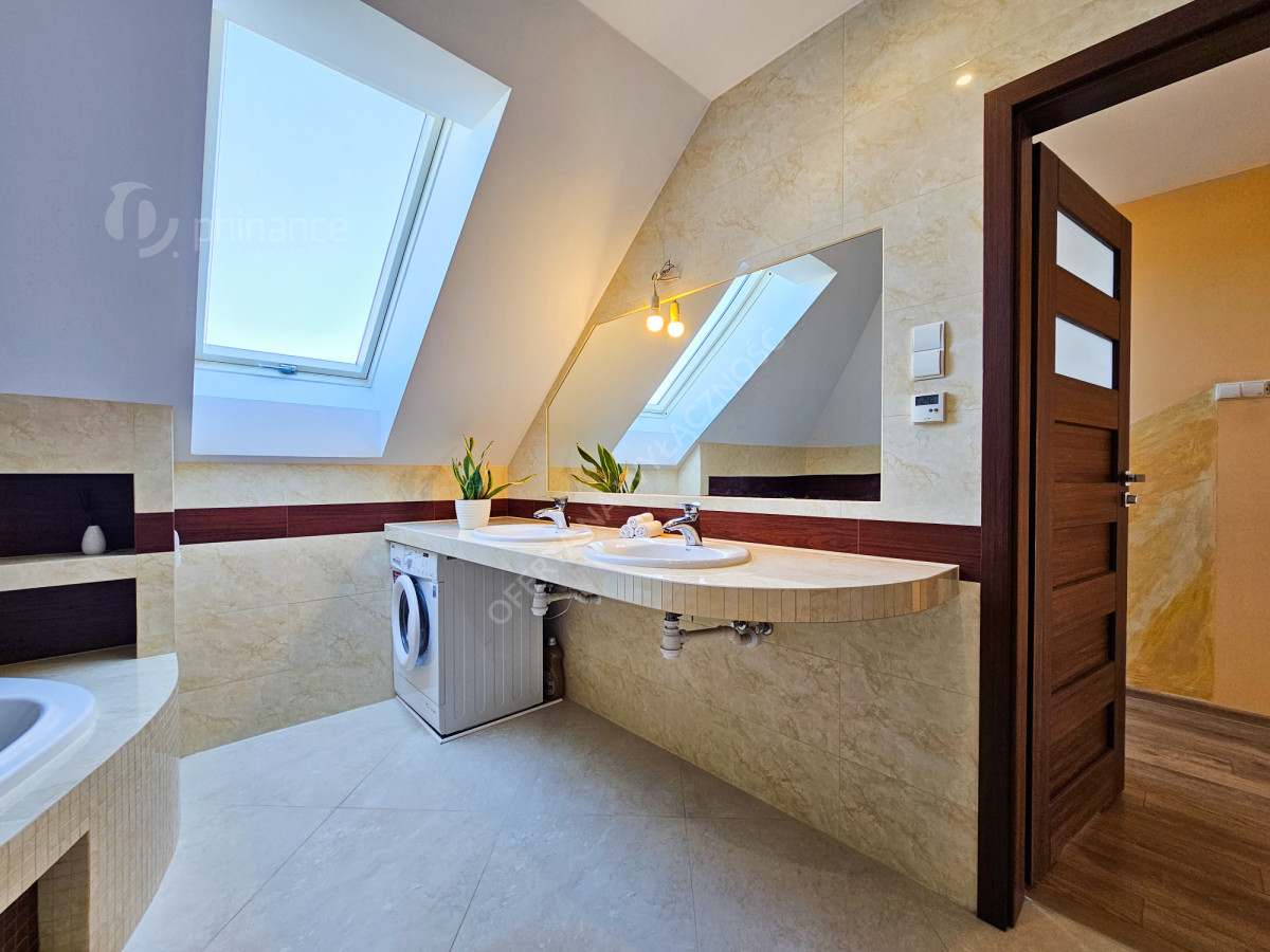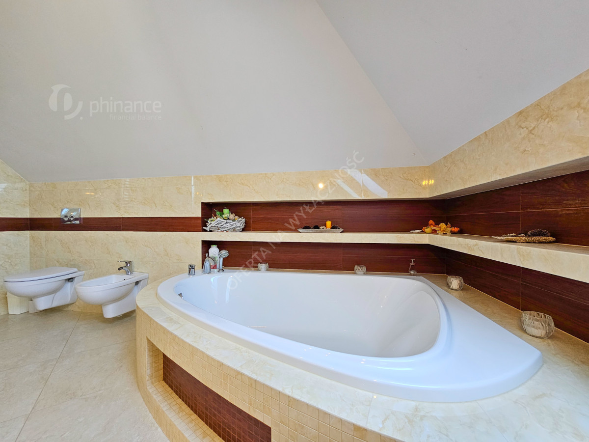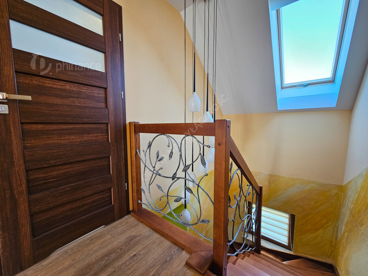 Dom wykończony został z użyciem materiałów najwyższej jakości, co podkreśla jego elegancję oraz trwałość na lata. Dodatkowym atutem jest piękny, zadbany ogród z licznymi nasadzeniami, który stanowi prawdziwą oazę spokoju i relaksu po dniu pracy.