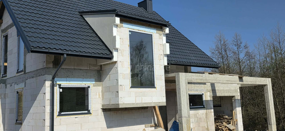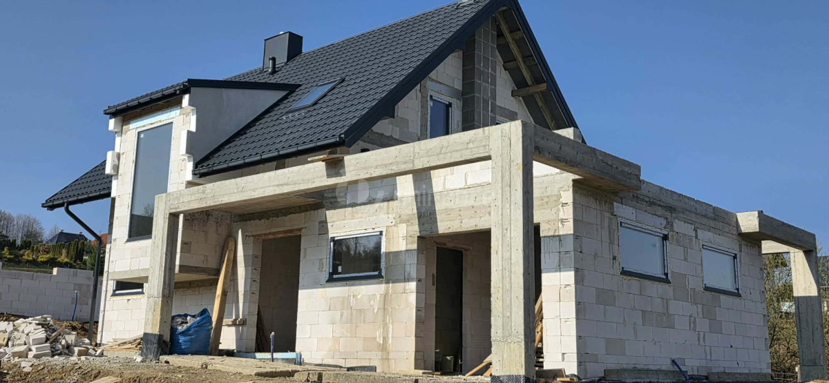 Mury: pustak Styrobud (24 cm), strop żelbetowy, więźba tradycyjna impregnowana.
