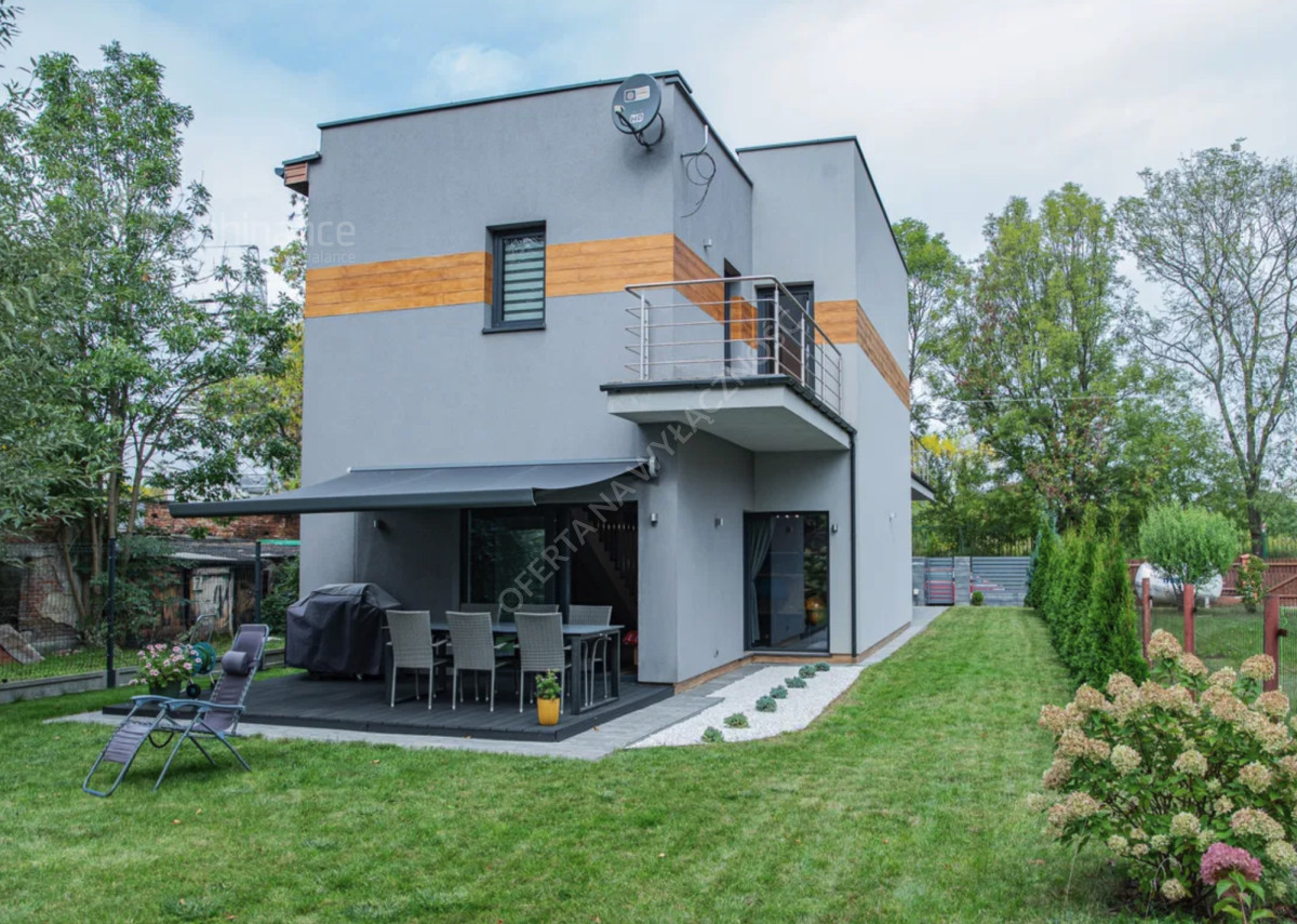 dwa balkony oraz taras z wyjściem na zadbany ogród