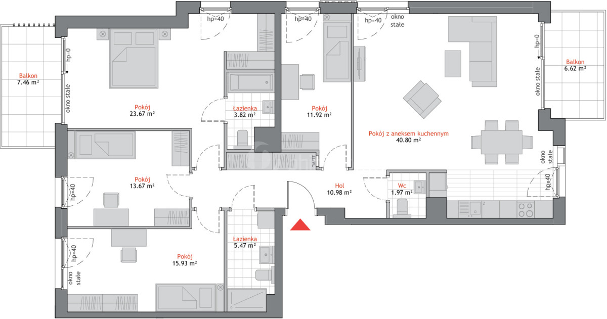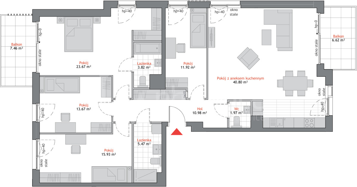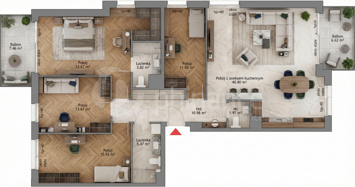 • Dwa balkony — prywatne strefy wypoczynku, w tym balkon przy master bedroom.