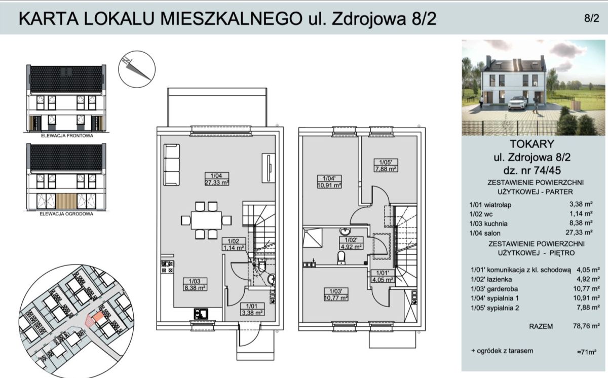 Każdy bliźniak to dom o powierzchni 100,1m². W skład całość wchodzi: