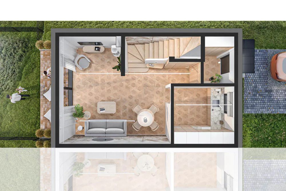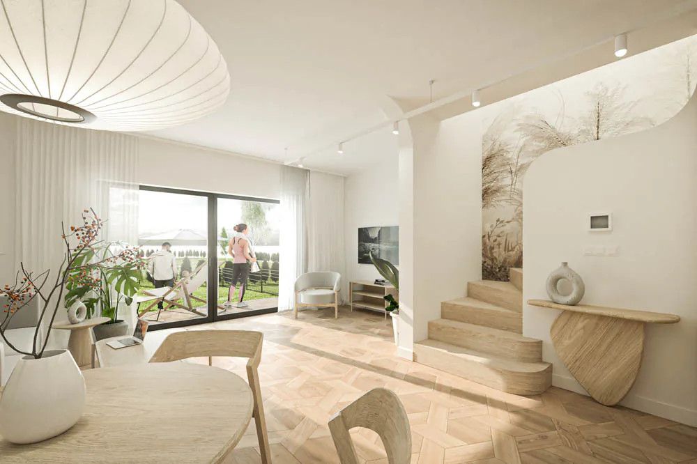 Parter to serce domu - salon 27,33 m² z przesuwnymi oknami tarasowymi i widokiem, który nigdy się nie nudzi. Otwarta kuchnia (8,38 m²) stworzy idealną przestrzeń do wspólnych spotkań - a po połączeniu z salonem uzyskacie ponad 35,5 m² przestrzeni do życia.