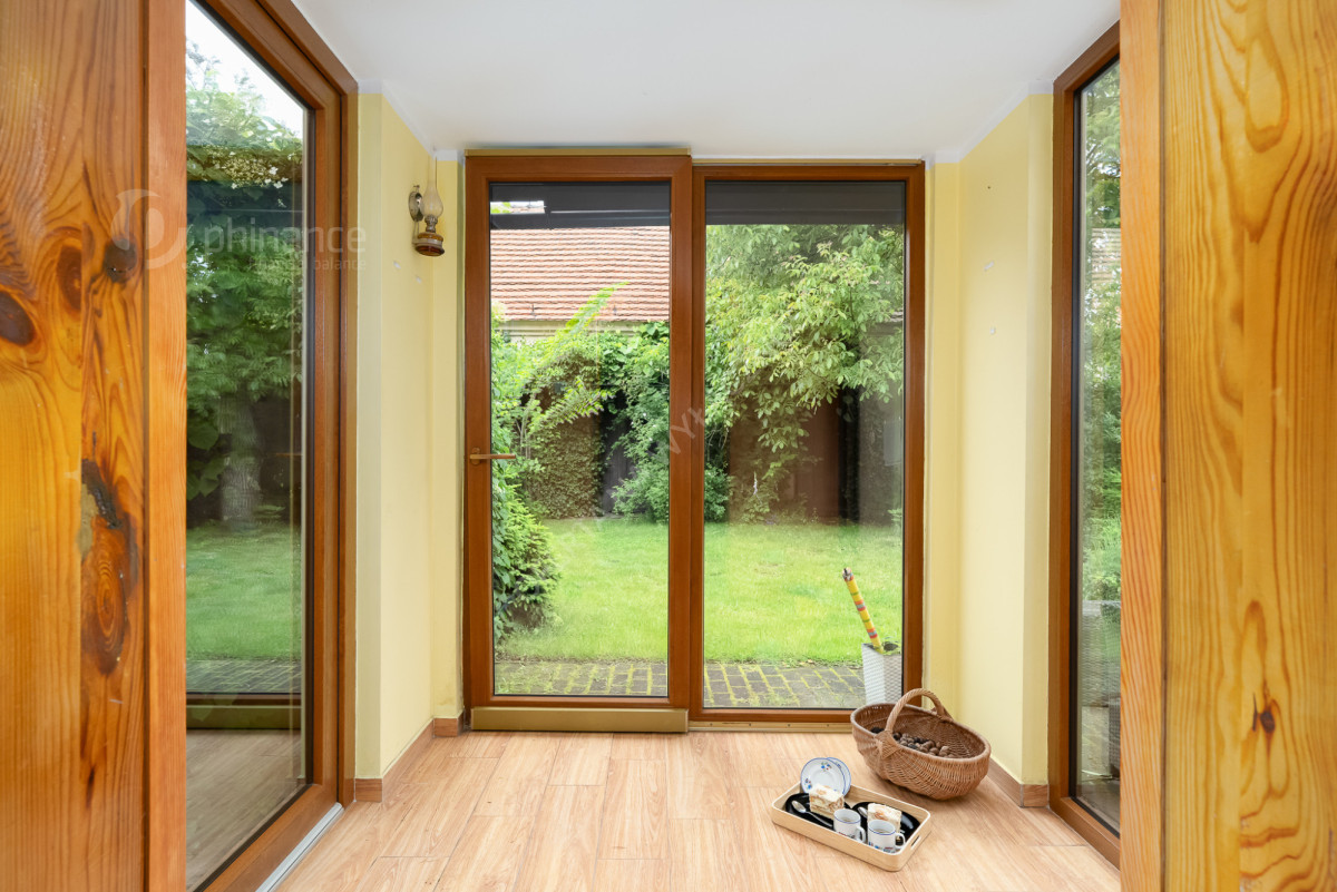 Weranda z wyjściem na ogród, idealna na poranną kawę lub popołudniowy relaks w cieniu rozłożystego orzecha włoskiego.