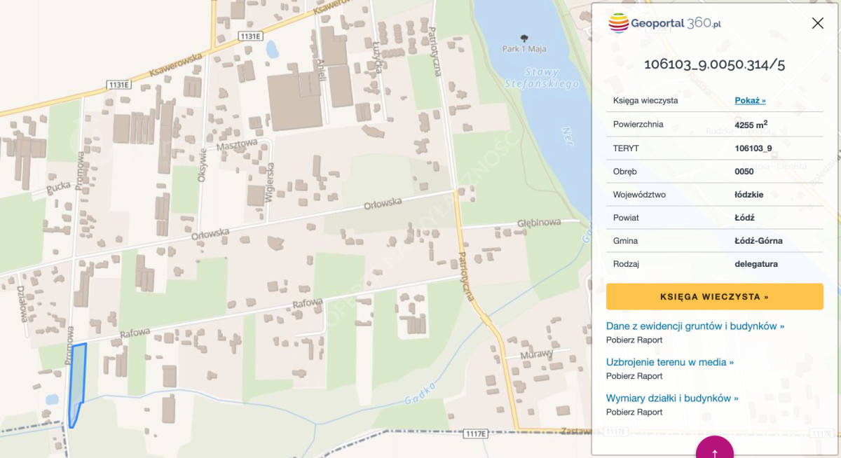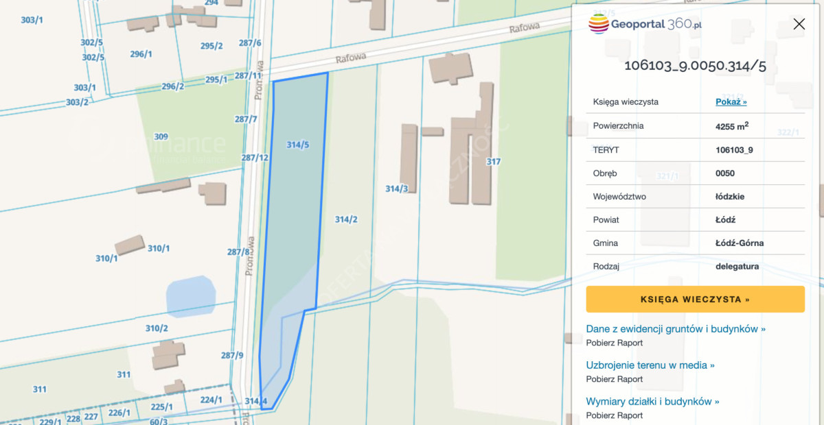 Łódź ul. Rafowa: działka budowlana nr 314/5 o pow. 4.255 m2 (w zdjęciach screeny z Geoportalu).