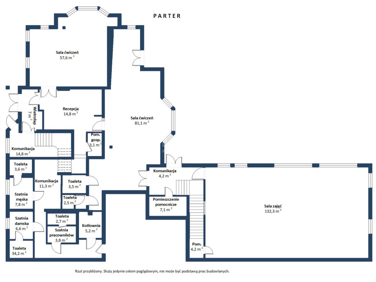 - Dwie nowoczesne sale ćwiczeń: 57,6 m² i 81,1 m²