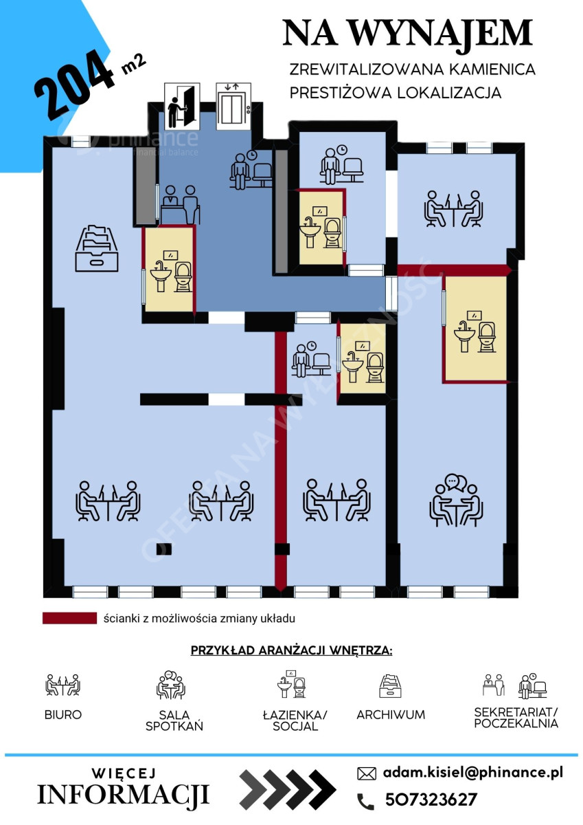 Oferowany lokal składa się obecnie z 5 wydzielonych pomieszczeń, zaś część znaczonych na rzucie ścianek działowych nadaje się do usunięcia, dzięki czemu przestrzeń jest bardzo plastyczna i może zostać zaaranżowana zgodnie z indywidualnymi potrzebami najemcy. Dodatkowym atutem jest winda wjeżdżająca bezpośrednio do biura, instalacja klimatyzacji oraz światłowód.