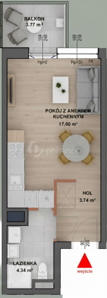 - Pokój z aneksem kuchennym: 17,60 m²