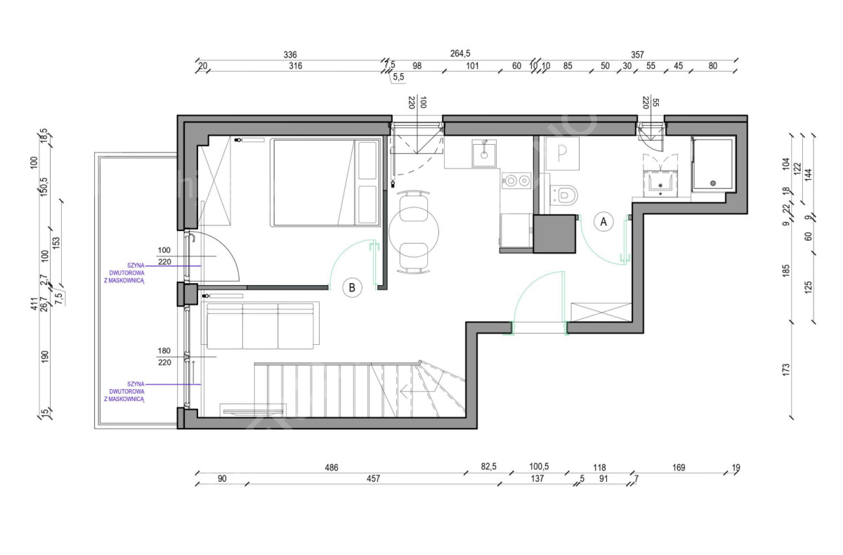 * salon z aneksem kuchennym,