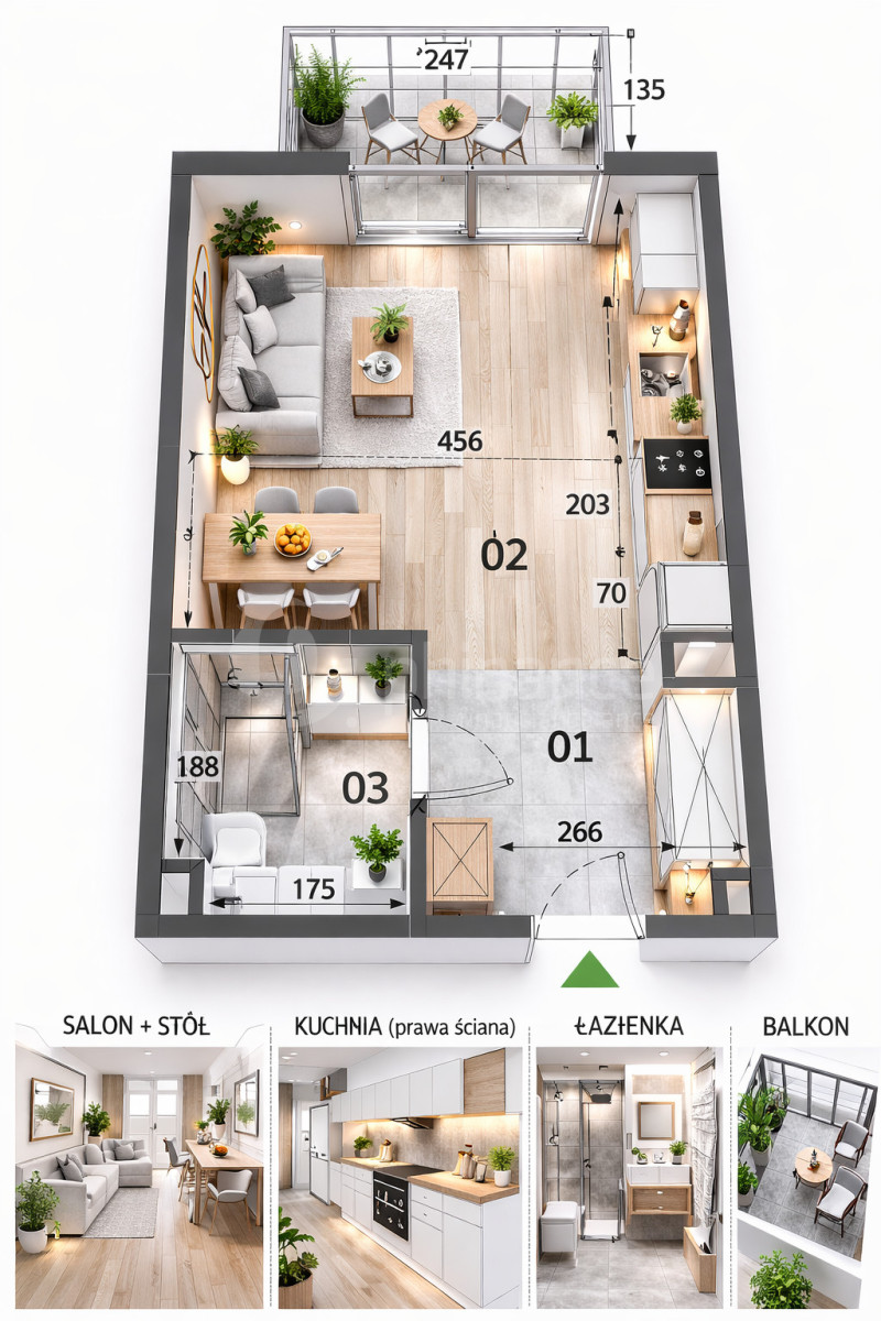 W projekcie przewidziano funkcjonalne układy mieszkań obejmujące lokale 1-, 2-, 3-pokojowe, zaprojektowane tak, aby zapewnić maksymalne wykorzystanie przestrzeni oraz dobre doświetlenie pomieszczeń.