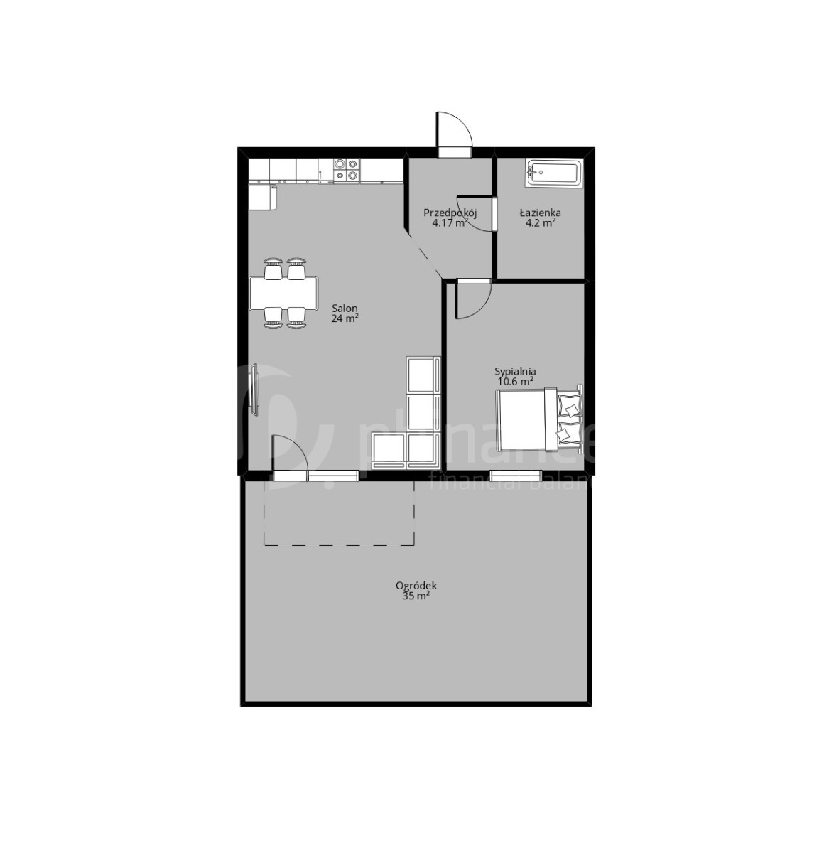 Salonu z kuchnią (24m²) z wyjściem na ogródek (35 m²),