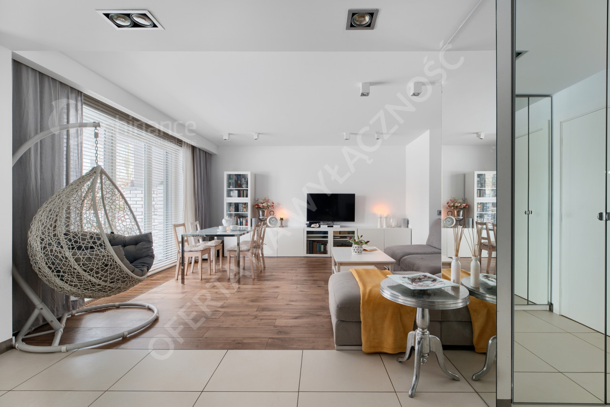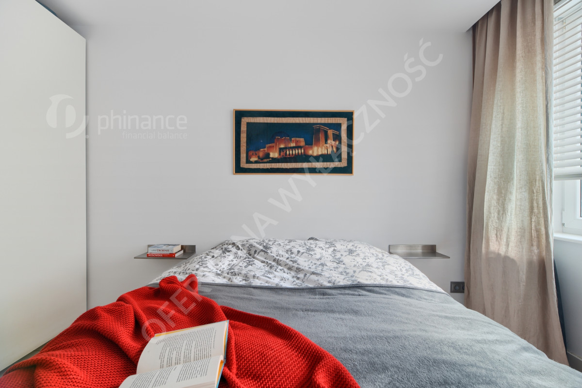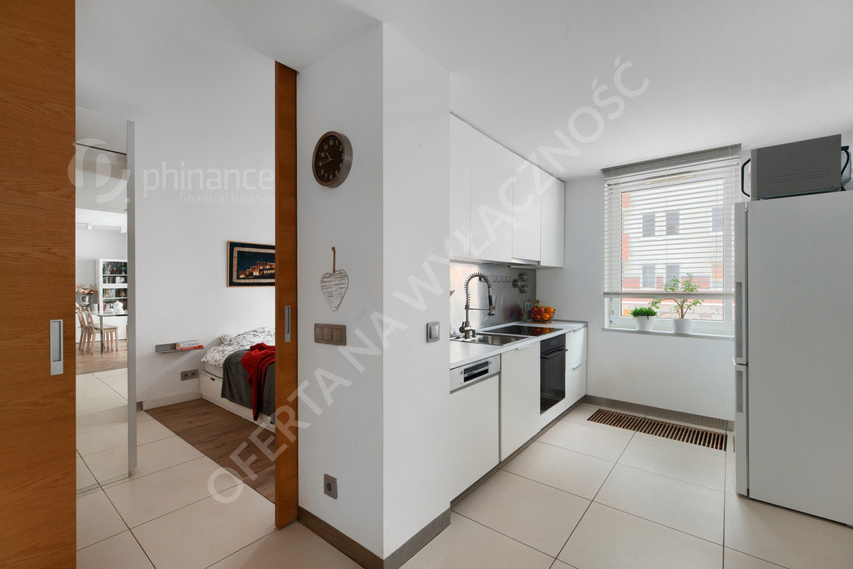 Dodatkowym atutem jest niestandardowy system drzwi przesuwnych pomiędzy salonem, sypialnią i łazienką oraz system smart home umożliwiający sterowanie roletami, ogrzewaniem i oświetleniem.