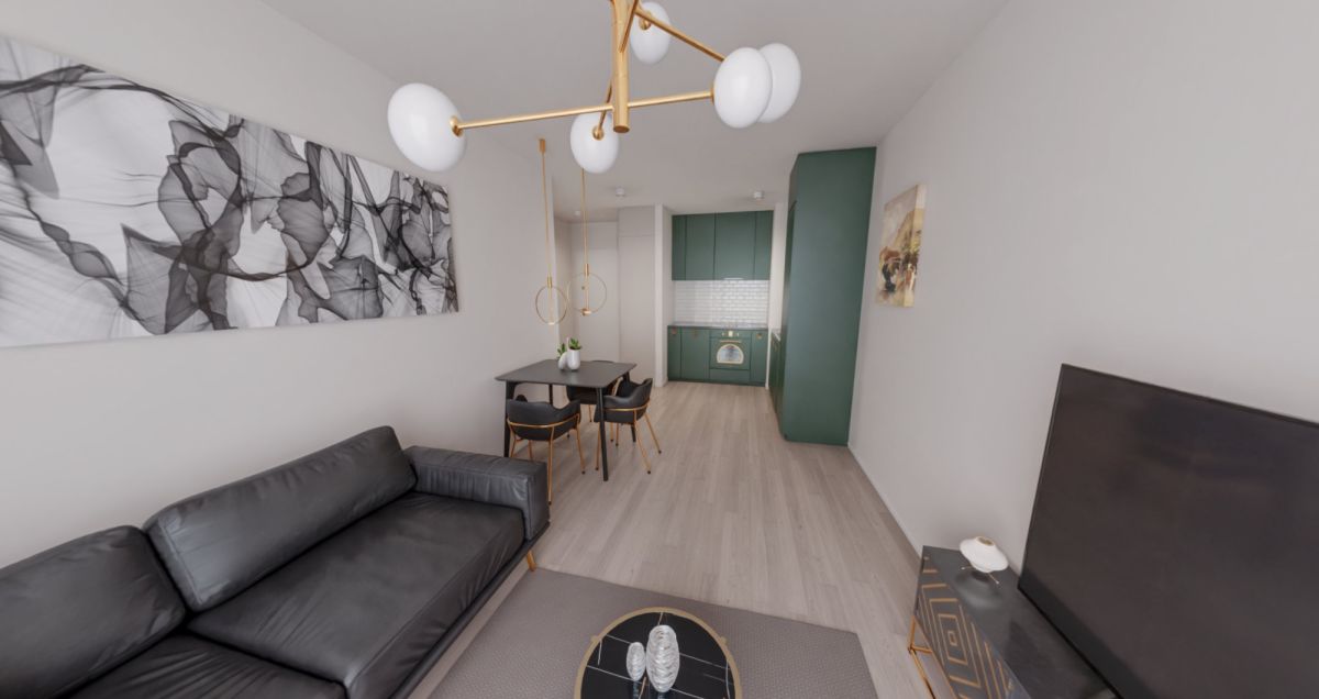 - Salon z aneksem kuchennym otwarta, jasna przestrzeń dzienna