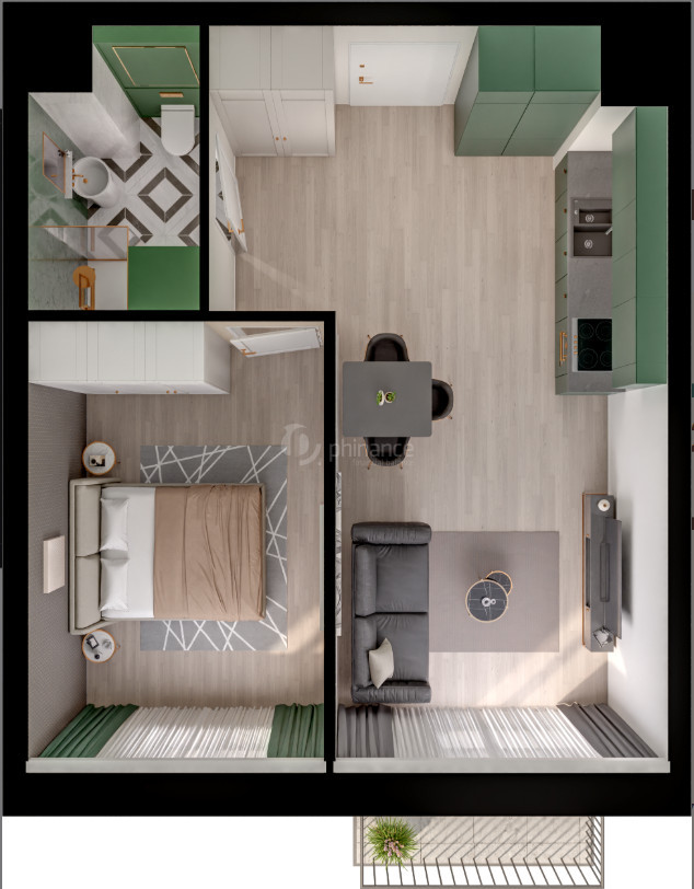 Rzut oraz wizualizacje w ofercie przedstawiają przykładowy sposób aranżacji wnętrza. Powyższa oferta ma charakter informacyjny i nie stanowi oferty handlowej w rozumieniu art. 66 §1 Kodeksu Cywilnego.
