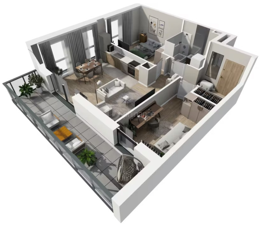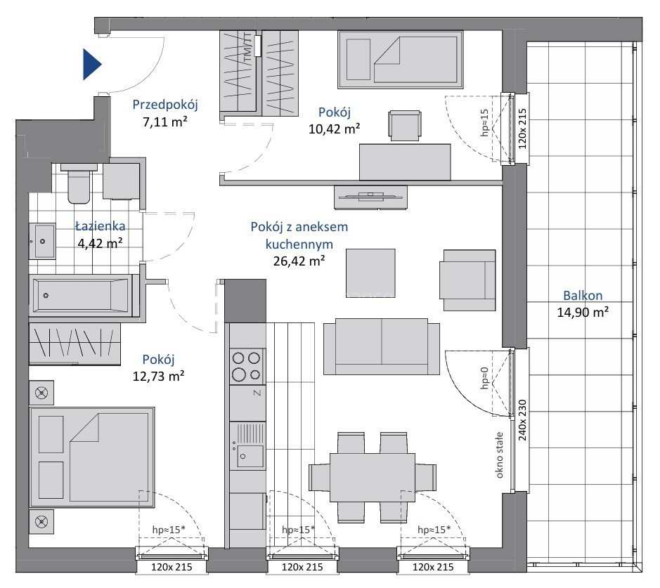 • Duży balkon 14,90 m² — rzadkość w tej klasie mieszkań; realne przedłużenie strefy dziennej.