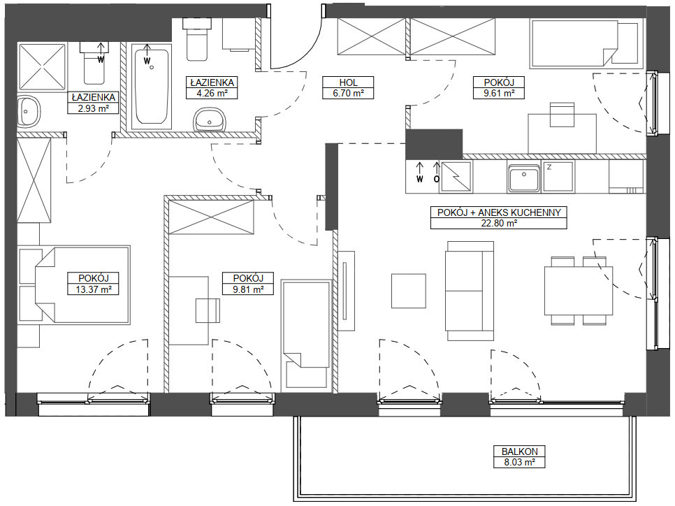 • Duży balkon ekspozycja zachodnia (8,03 m²)