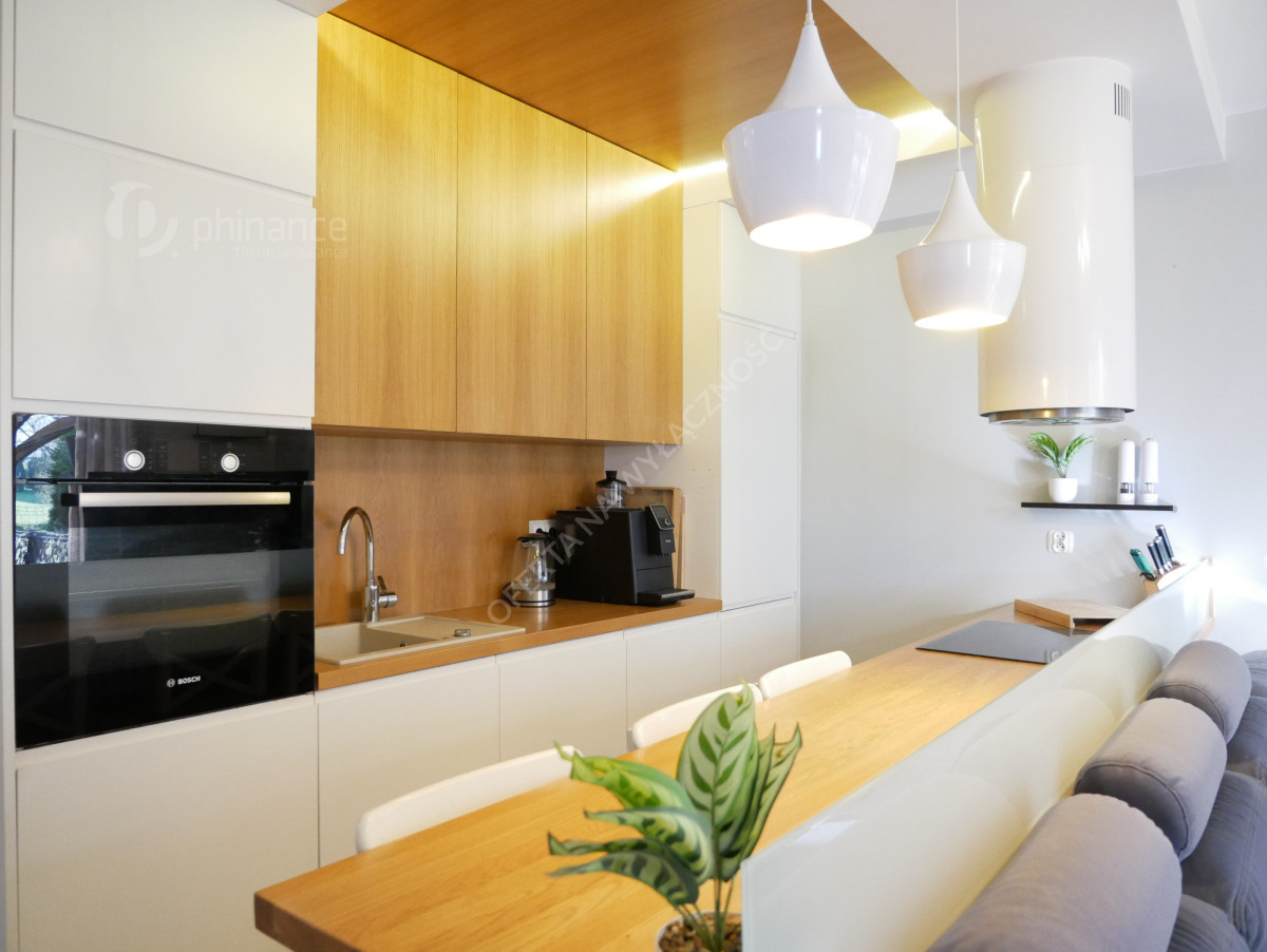 Mieszkanie znajduje się na parterze w szeregówce, wybudowanej w 2015 r. Wokół brak jest wysokiej zabudowy a całość osiedla została ogrodzona i otoczona przez drzewa, co tworzy kameralny klimat tego miejsca. Samo mieszkanie zostało wykończone w wysokim, nowoczesnym stylu, z dobrej jakości materiałów, które będą służyć jeszcze na lata. Nie jest konieczne żadne ponoszenie dodatkowych nakładów finansowych związanych z remontem czy wykończeniem, by móc w nim mieszkać.
