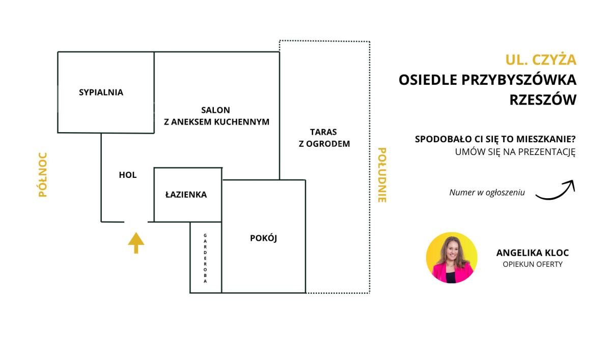 Rzeszów, ul. Czyża 13 - Przybyszówka - 52,55 m2, salon z aneksem kuchennym, gabinet, sypialnia, łazienka, holl, gotowe do wprowadzenia i zamieszkania, prywatny, 40 m2 ogródek, przypisane miejsce postojowe, komórka lokatorska (ok. 2 m2) + garaż 1-stanowiskowy możliwy do zakupu
