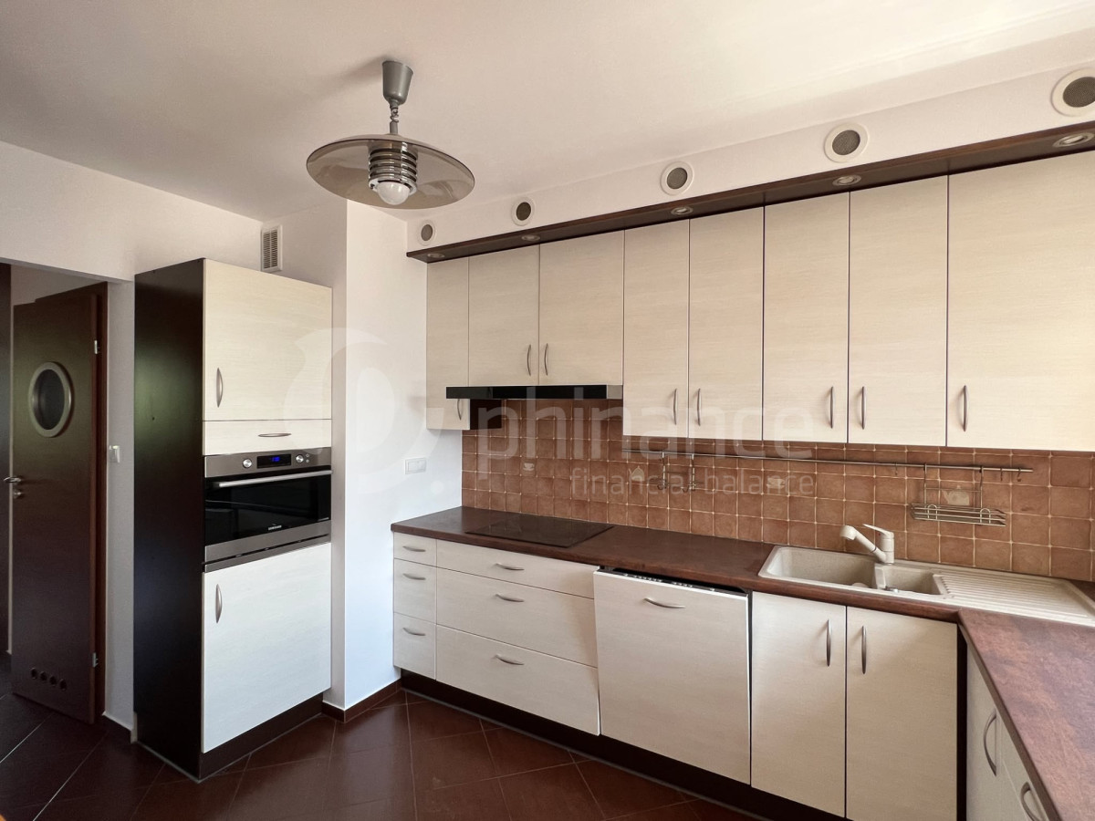 Kuchnia: duży blat roboczy, zabudowa kuchenna, lodówka (200 cm), zmywarka (60 cm), płyta indukcyjna (60 cm), piekarnik z funkcją mikrofalówki, okap (90 cm), miejsce na stół dla 5 osób