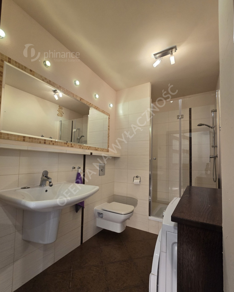 - łazienka 4,6m2 z ogrzewaniem podłogowym, wyposażona w kabinę prysznicową, umywalkę, pralkę, WC.