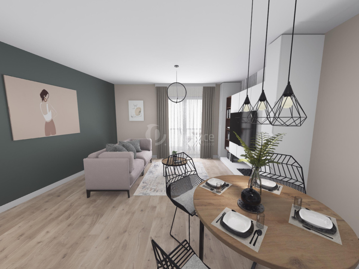 • Salon z aneksem kuchennym 22,78 m2 z wyjściem na balkon 6,1 m2