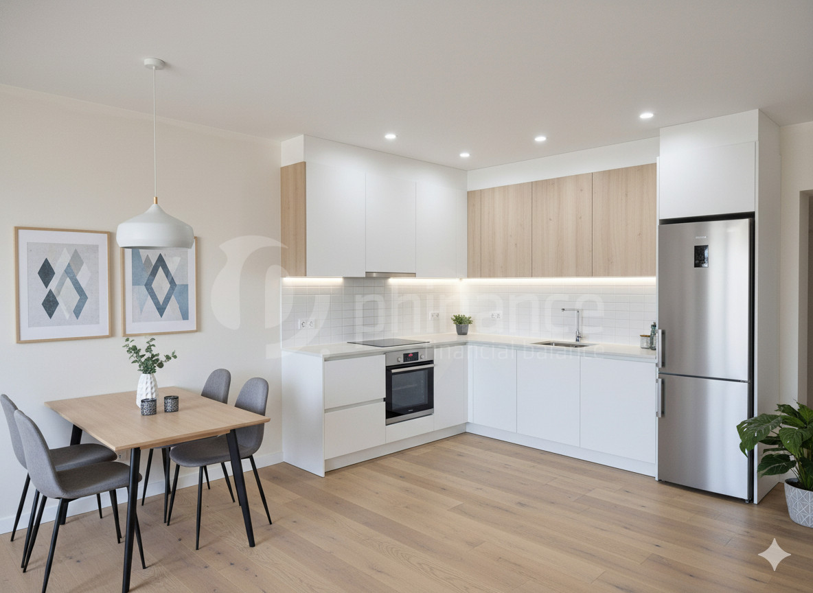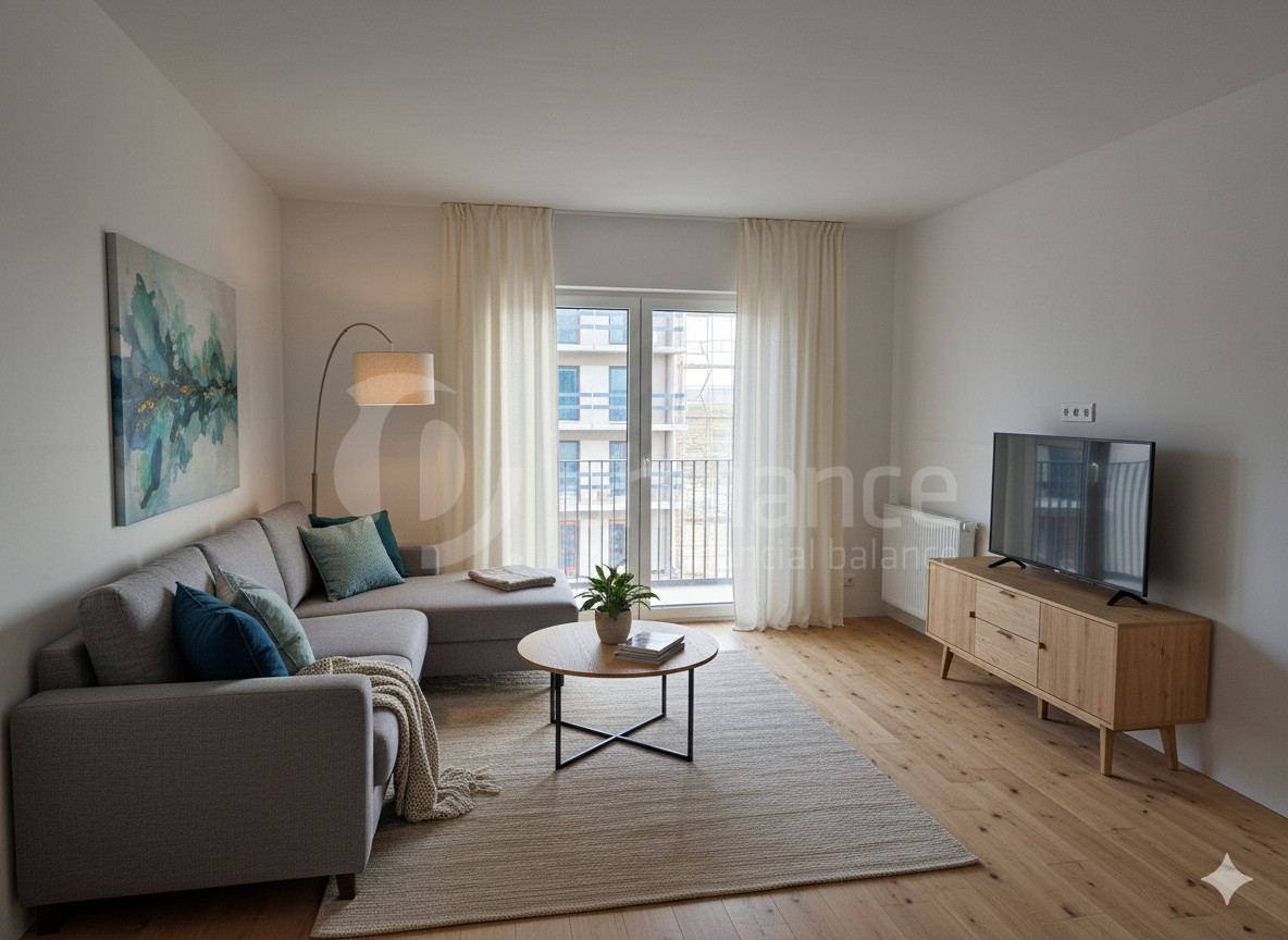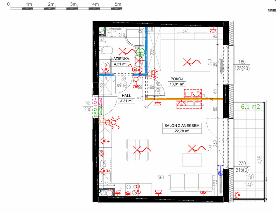 • Salon z aneksem kuchennym 22,78 m2 z wyjściem na balkon 6,1 m2