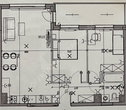 - salon z wyposażonym aneksem kuchennym (28,5m2), wyjściem na loggię (9m2),