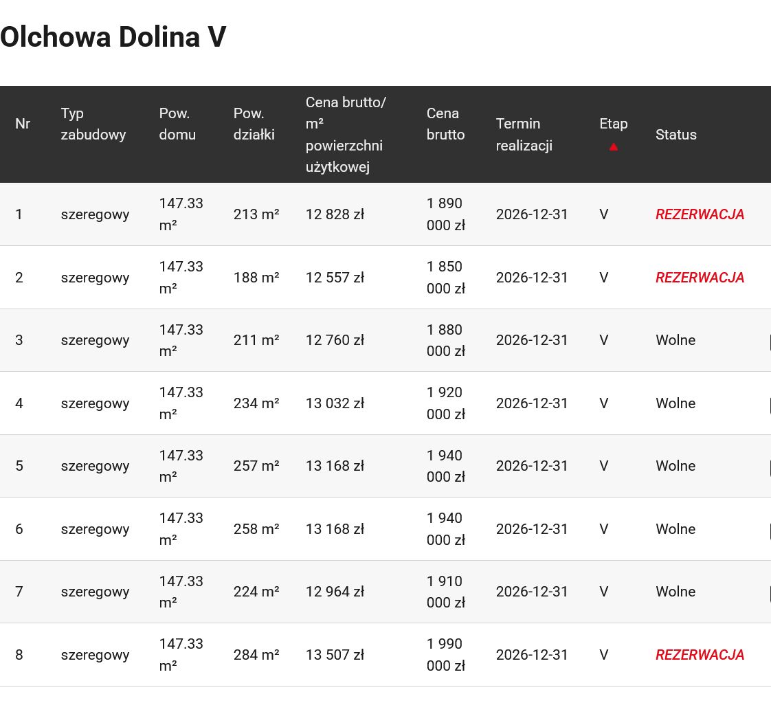 Domy w inwestycji: (powierzchnia/powierzchnia działki/ cena ofertowa/dostępność)
