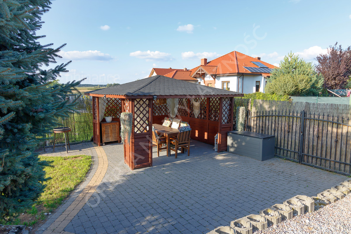 Na zagospodarowanej działce znajduje się taras, altana grilowa oraz wolnostojący garaż w lekkiej konstrukcji, aktualnie pełniący funkcję magazynową.