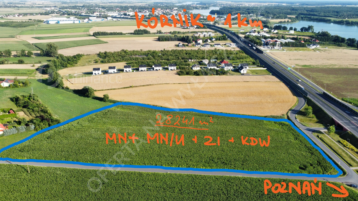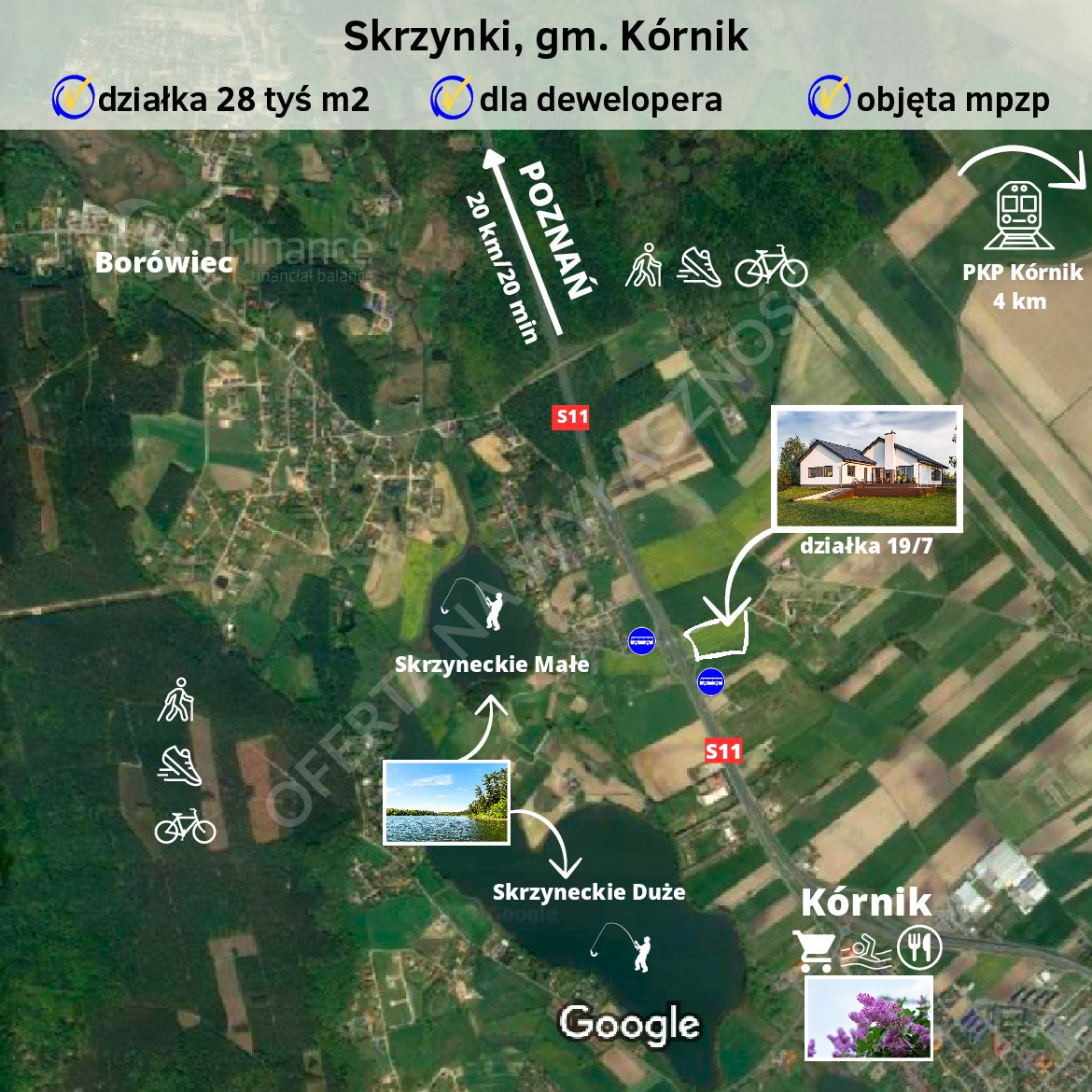 Dojazd drogą asfaltową. Do Kórnika ok 1,5 kilometra, ok 20km do Poznania (Rondo Rataje).W pobliżu znajduje się przystanek komunikacji podmiejskiej (400 metrów). Bezpośrednie sąsiedztwo to tereny rolnicze oraz zabudowa jednorodzinna.
