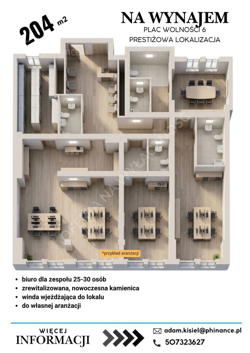Do wynajęcia przestronna powierzchnia biurowa o powierzchni 204 m², zlokalizowana w reprezentacyjnej, zrewitalizowanej kamienicy z widokiem na Plac Wolności Poznaniu. Możliwość zrealizowania przestrzeni open space lub mniejszych pomieszczeń biurowych. To komfortowa przestrzeń dla zespołu 25-30 osób.