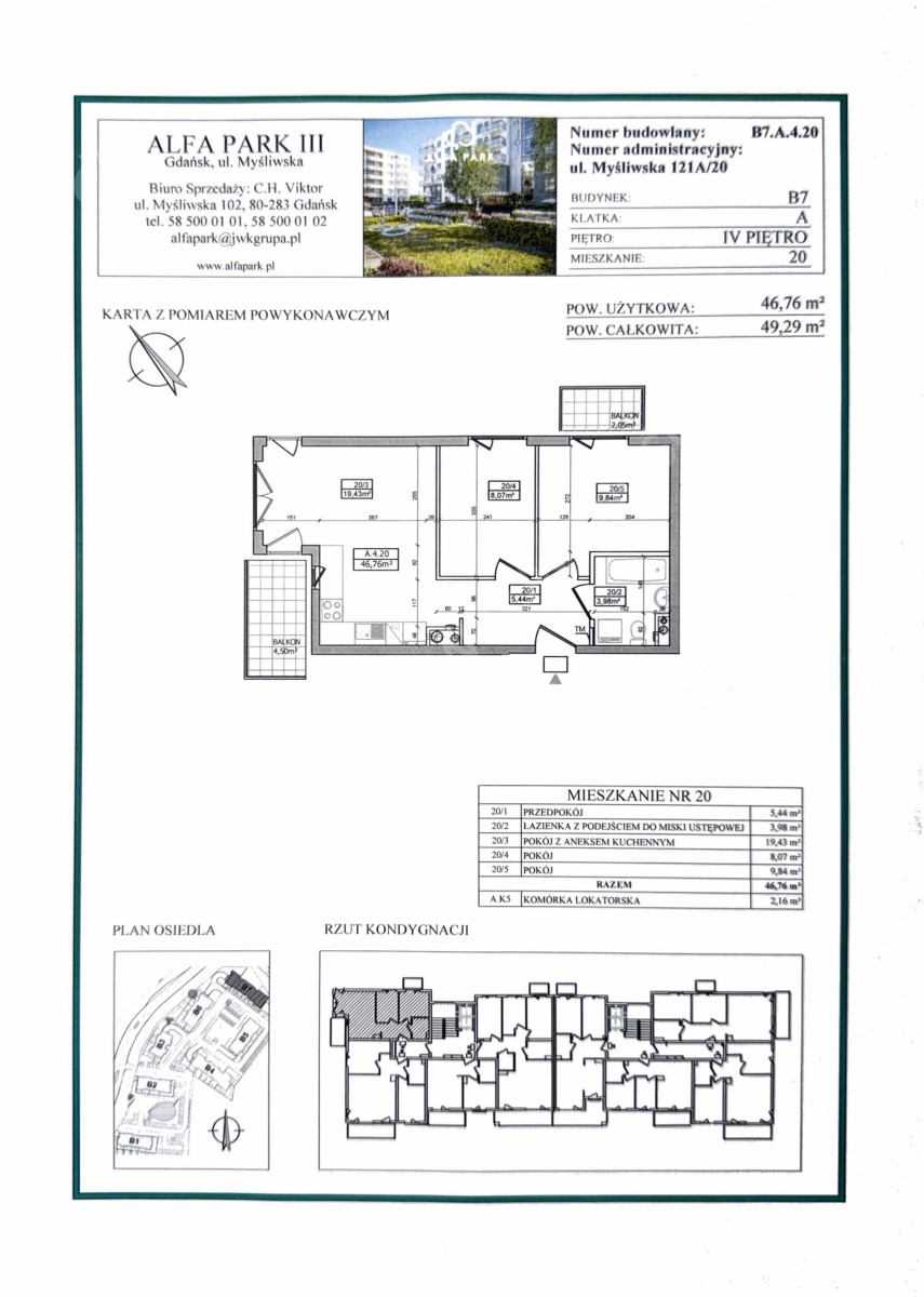 Na sprzedaż jasne i funkcjonalne mieszkanie o powierzchni 46,50 m², położone na 4 piętrze w 5-piętrowym budynku z nowego budownictwa przy ul. Myśliwskiej w dzielnicy Gdańsk - Jasień. Osiedle Alfa Park 3.