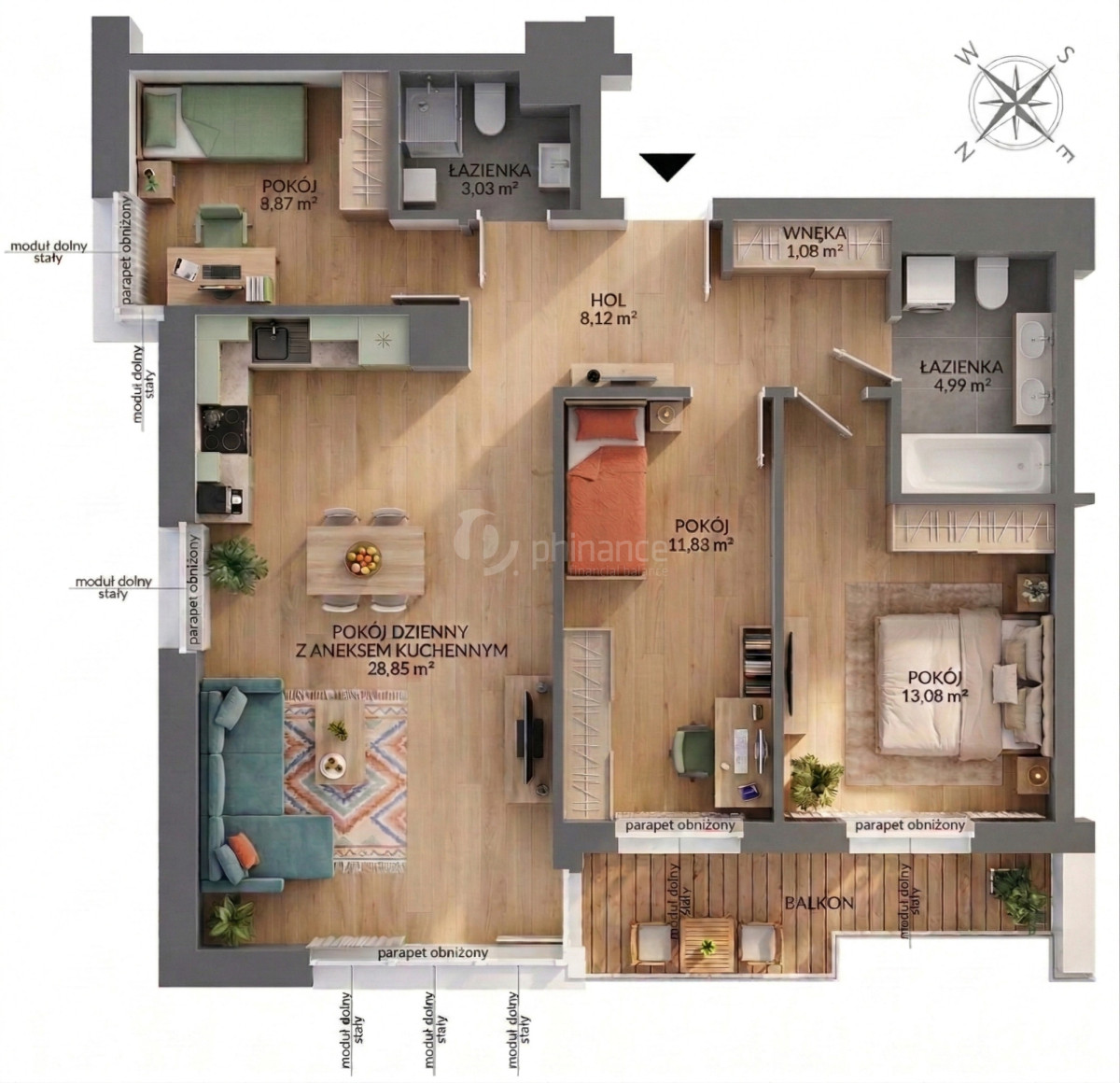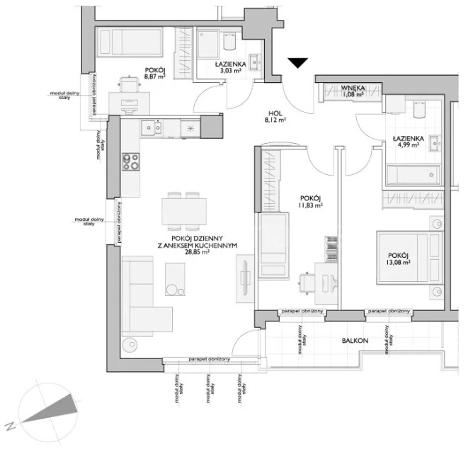 • Pokój dzienny z aneksem kuchennym: 28,85 m²