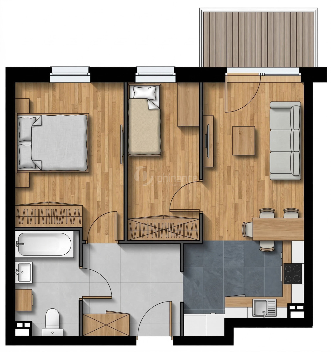 Układ mieszkania jest wyjątkowo funkcjonalny - duża garderoba pełni rolę dodatkowego pomieszczenia gospodarczego (z możliwością adaptacji na mini pokój) a ustawny salon z aneksem daje wiele możliwości aranżacyjnych.