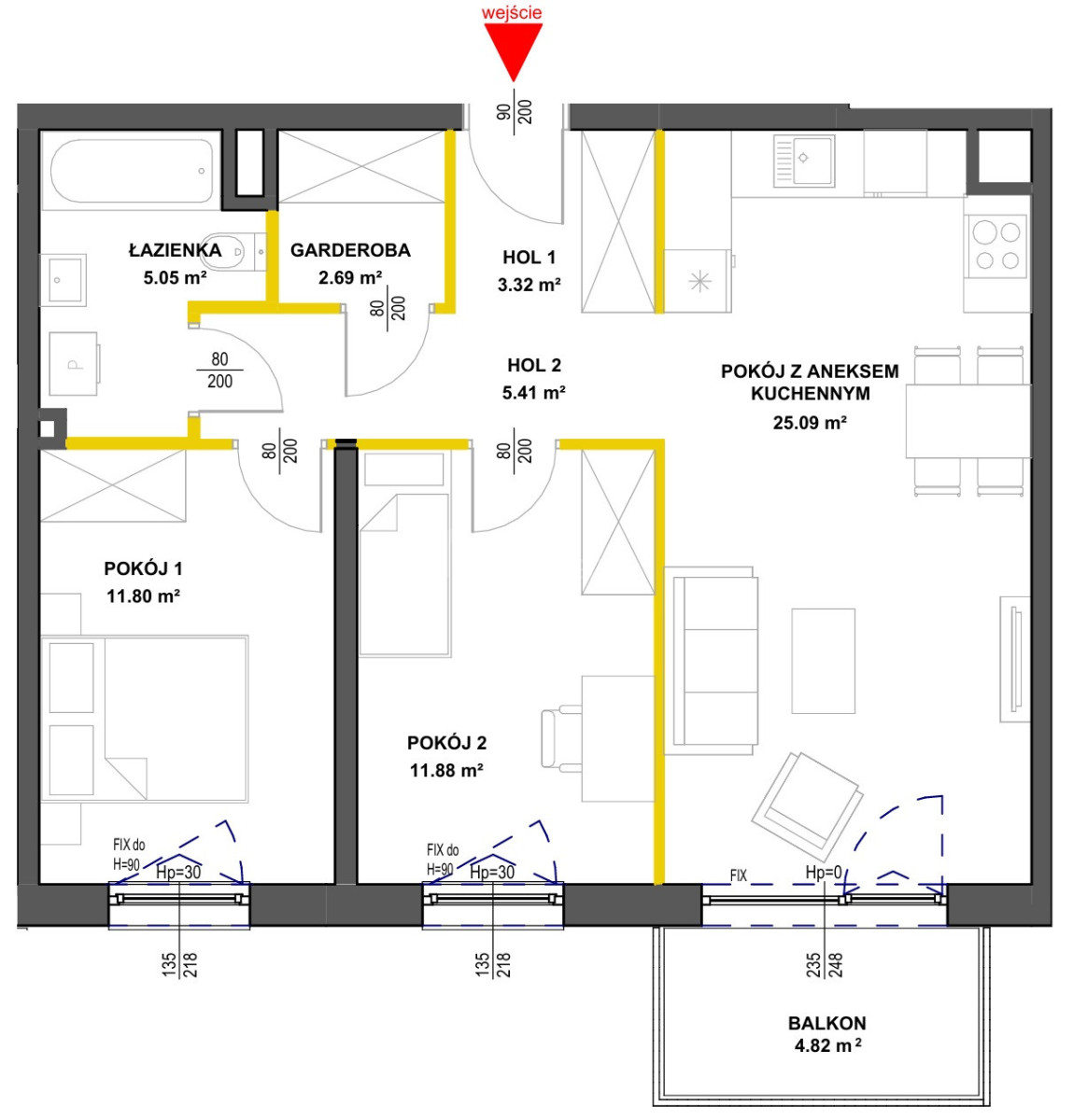 - Pokój z aneksem kuchennym: 25,09 m²