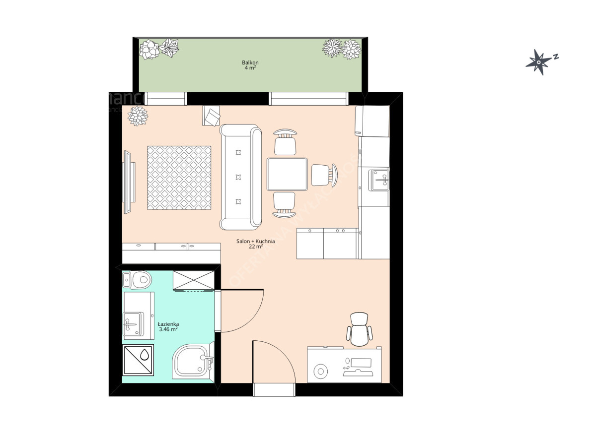 - FUNKCJONALNY UKŁAD: Mieszkanie o pow. 25,51 m² składa się z przestronnego salonu z aneksem kuchennym (22,05 m²), który bez problemu pomieści zarówno wygodną rozkładaną sofę, jak i kącik do pracy. Duża łazienka (3,46 m²) to luksus w tej kategorii mieszkaniowej.