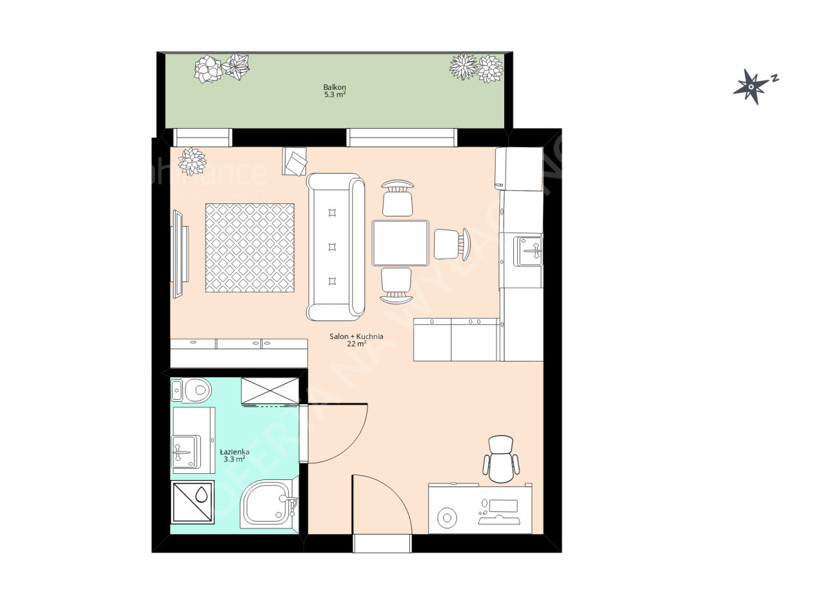- FUNKCJONALNY UKŁAD: Mieszkanie o pow. 25,31 m² składa się z przestronnego salonu z aneksem kuchennym (21,92 m²), który bez problemu pomieści zarówno wygodną rozkładaną sofę, jak i kącik do pracy. Duża łazienka (3,39 m²) to luksus w tej kategorii mieszkaniowej.