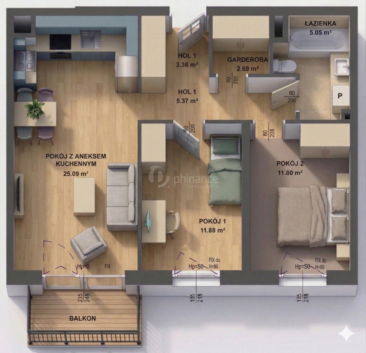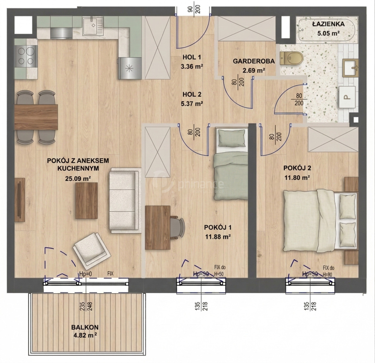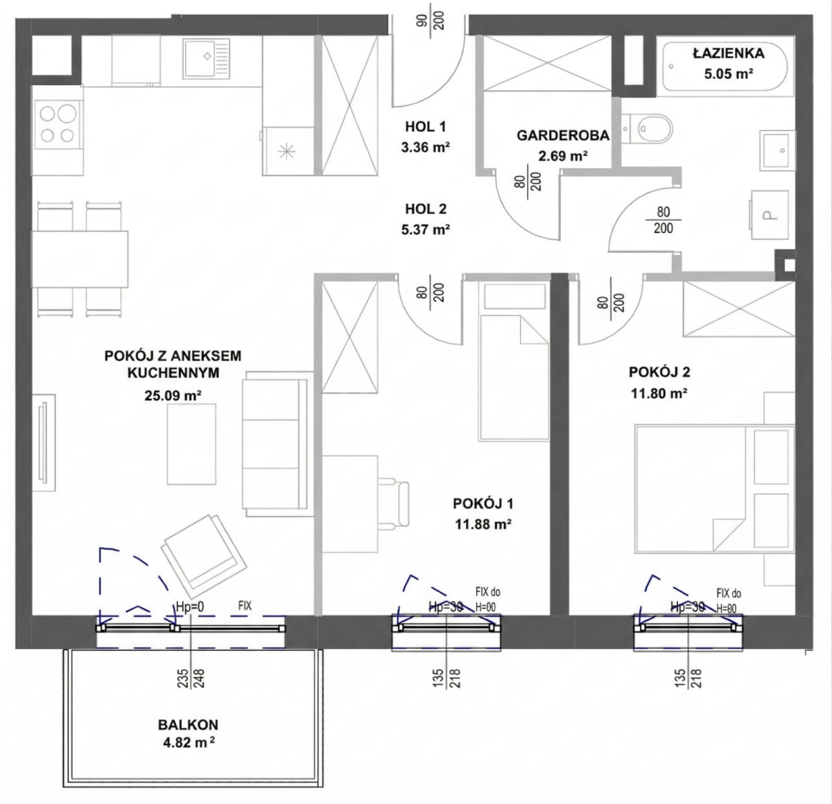 - Pokój z aneksem kuchennym: 25,09 m²