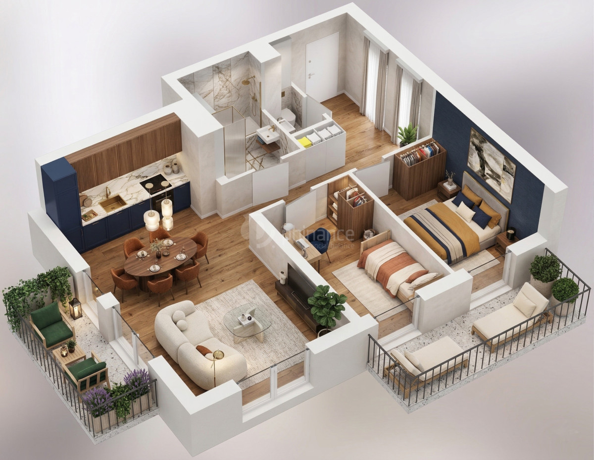 • Przestronny salon (26,79 m²) z aneksem kuchennym i balkonem - idealne miejsce do relaksu i przyjmowania gości.
